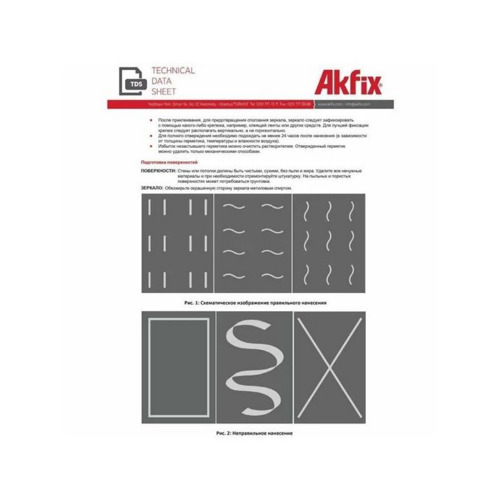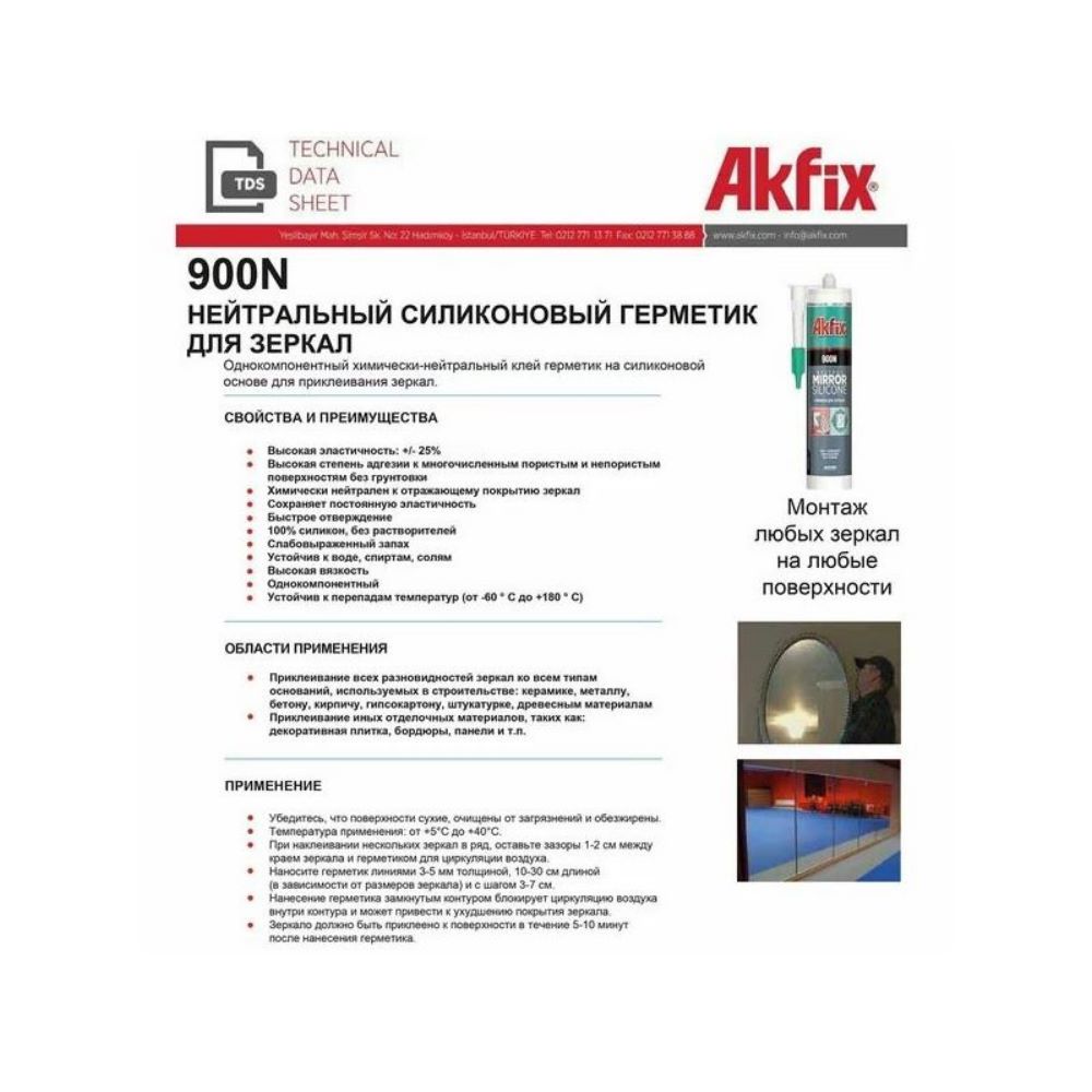 Akfix 900N — однокомпонентный нейтральный силиконовый клей-герметик, затвердевающий под воздействием влажности воздуха. Специально разработан для приклеивания зеркал к различным основаниям.