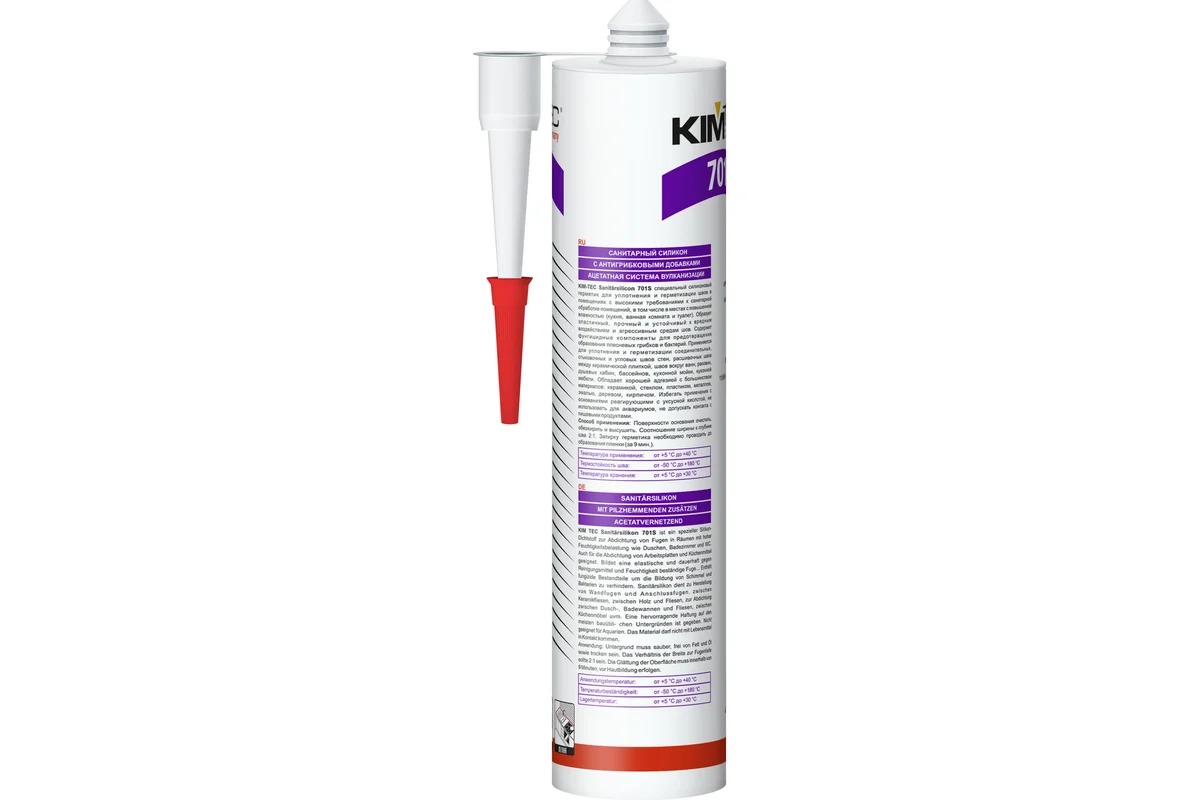 Силиконовый санитарный герметик KIM TEC бесцветный 701S 280мл 02-01-52 Высококачественный однокомпонентный санитарный (сантехнический) силиконовый герметик c ацетатной системой отверждения. Содержит комплекс фунгицидных компонентов, препятствующих появлению и развитию плесени и грибка. Специально разработан для помещений с повышенной влажностью.