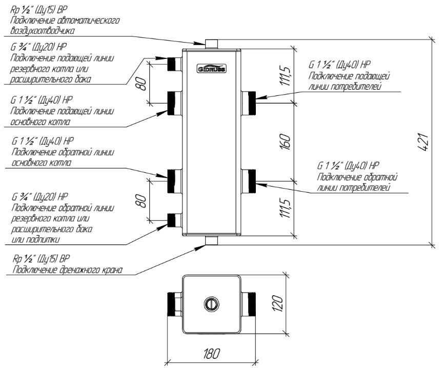 Гидрострелка GR-150-40 необходима в системах отопления до 1200 м2 для обвязки двух напольных котлов до 120 кВт с внешним насосом или 3-4 настенных котлов общей мощностью до 150 кВт с возможностью подключения резервного электрокотла к доп. подключениям G 3/4".