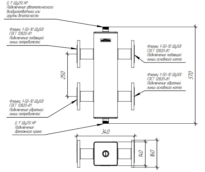 Гидравлический разделитель GR-250-50F необходим в системах отопления до 2000 м2 для обвязки одного или нескольких котлов общей мощностью до 250 кВт с потребителями.