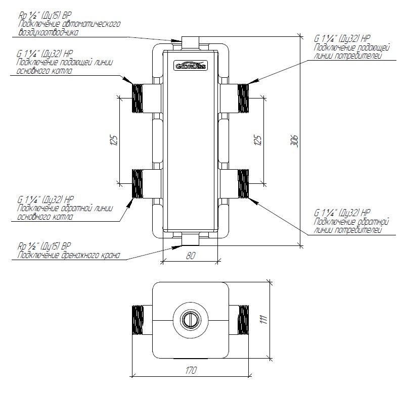 Гидроразделитель в теплоизоляции GR-80-32.EPP необходим в системах отопления до 700 м2 для обвязки двух настенных котлов до 80 кВт или одного напольного с внешним насосом до 70 кВт.