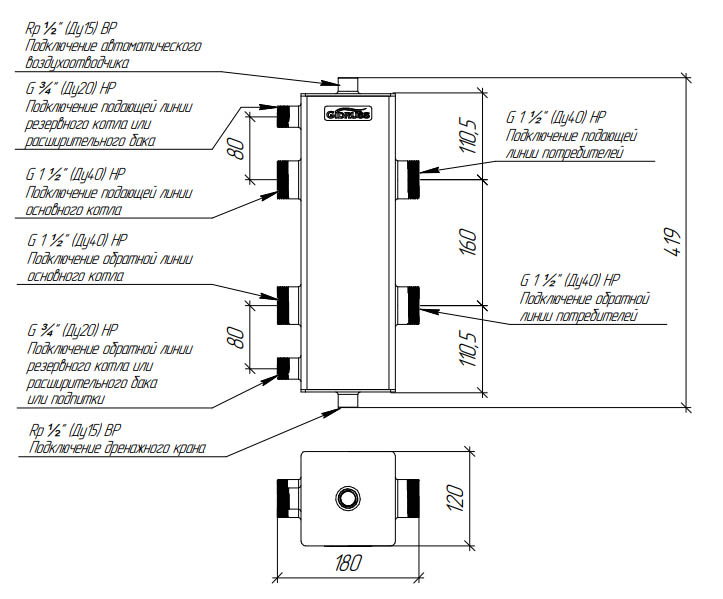 Гидравлический разделитель из нержавеющей стали GRSS-150-40 (нержавеющая гидрострелка Ду-40 до 150 кВт) используется в частных домах или коммерческих постройках отапливаемой площадью не более 1200 м2.