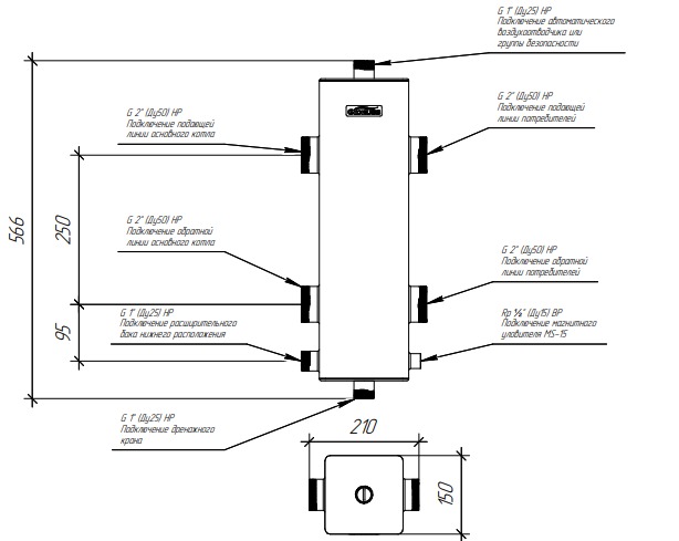 Гидравлический разделитель GRSS-250-50 из нержавеющей стали AISI 304 (08Х18Н10) необходим в системах отопления до 2000 м2 для обвязки одного или нескольких котлов общей мощностью до 250 кВт с потребителями.