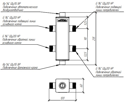 Гидрострелка из нержавеющей стали GRSS-40-20 на 3/4 дюйма необходима в системах отопления до 250 м(2) для обвязки настенного котла 18 24 25 30 31 кВт с подачей встроенного насоса менее 1.7 м(3)/ч (см. график остаточных напорных характеристик циркуляционного насоса в документации Вашего котла).