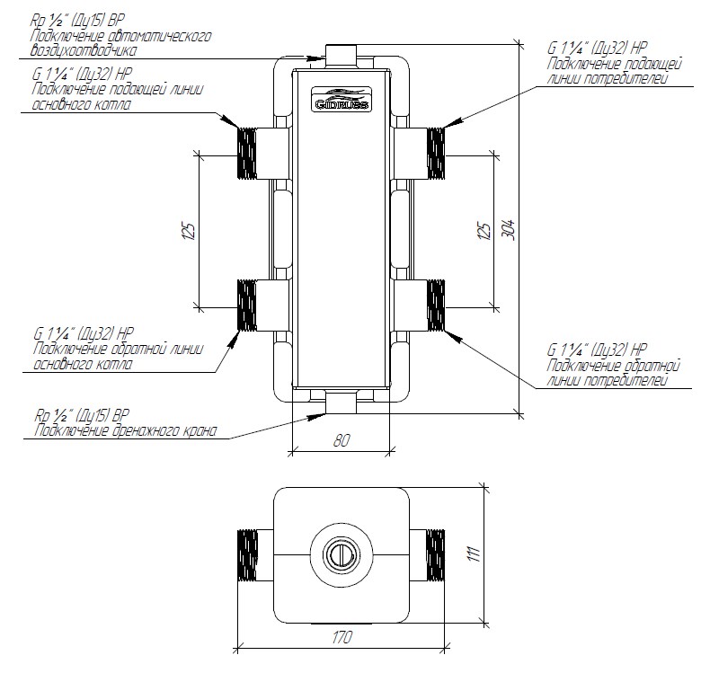 Гидроразделитель нержавеющий в термоизоляции GRSS-80-32.EPP необходим в системах отопления до 700 м(2) для обвязки двух настенных котлов до 80 кВт или одного напольного с внешним насосом до 70 кВт.