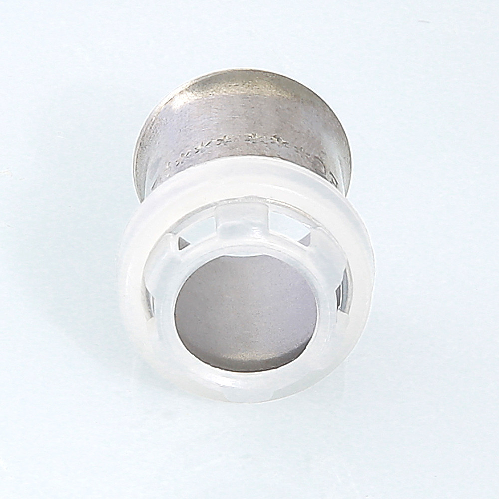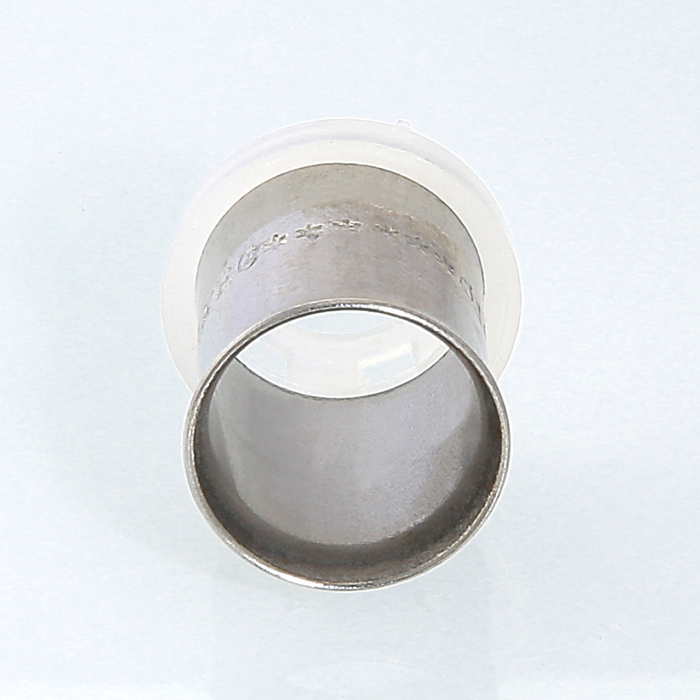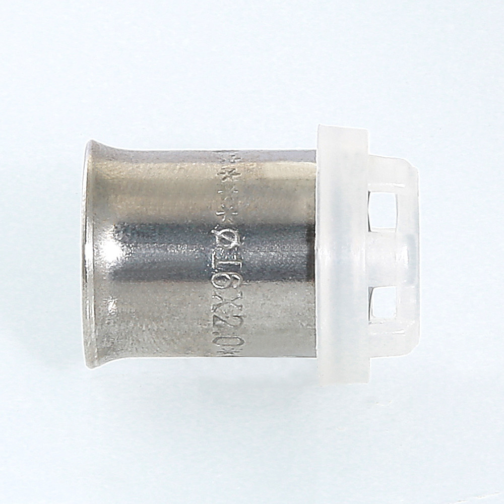 Гильза с обоймой-фиксатором для пресс-фитинга VALTEC. Материал гильзы – пластичная нержавеющая сталь марки AISI 304, обоймы-фиксатора – нейлон PA 6. Гильза имеет монтажный раструб. Конструкция фиксатора обеспечивает правильное расположение пресс-насадки инструмента на соединителе, контроль полноты одевания металлополимерной трубы на штуцер, отсутствие электрического контакта алюминиевой прослойки трубы и латунного корпуса фитинга. Усилие обжатия гильзы – не более 1200 Н.