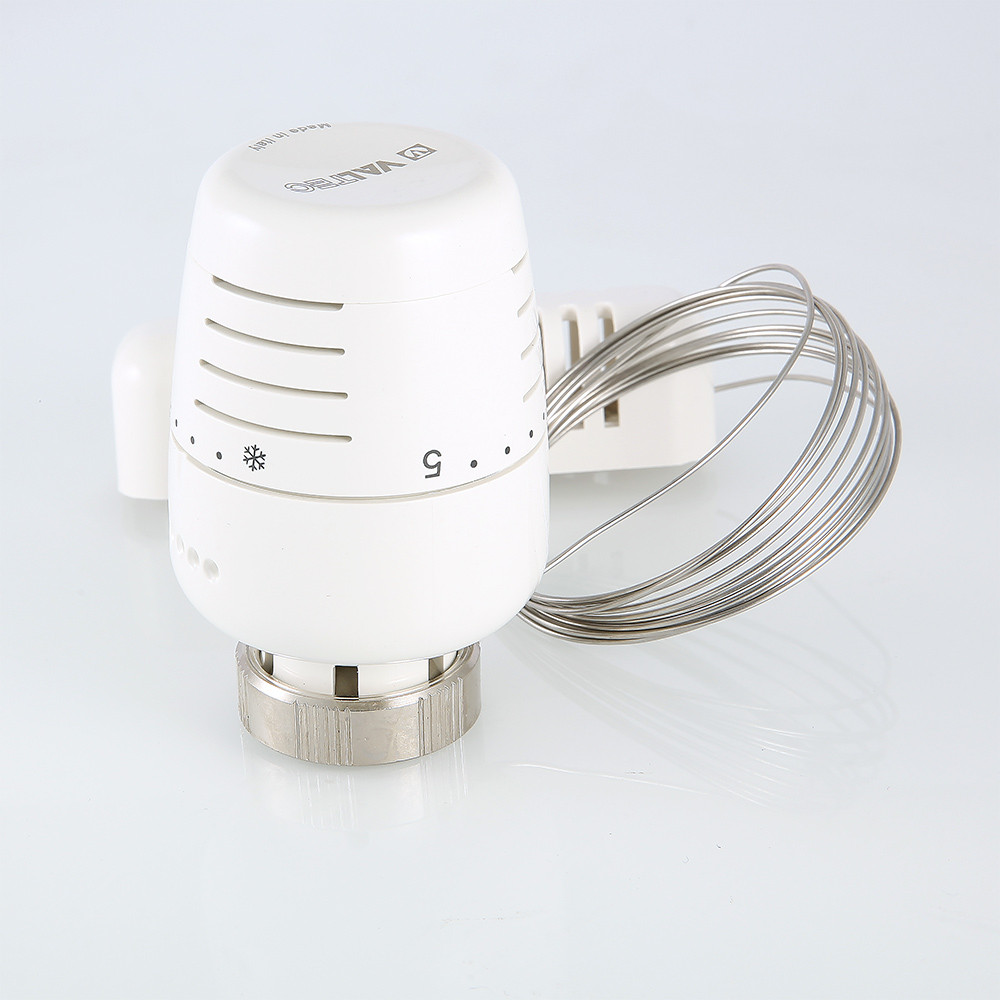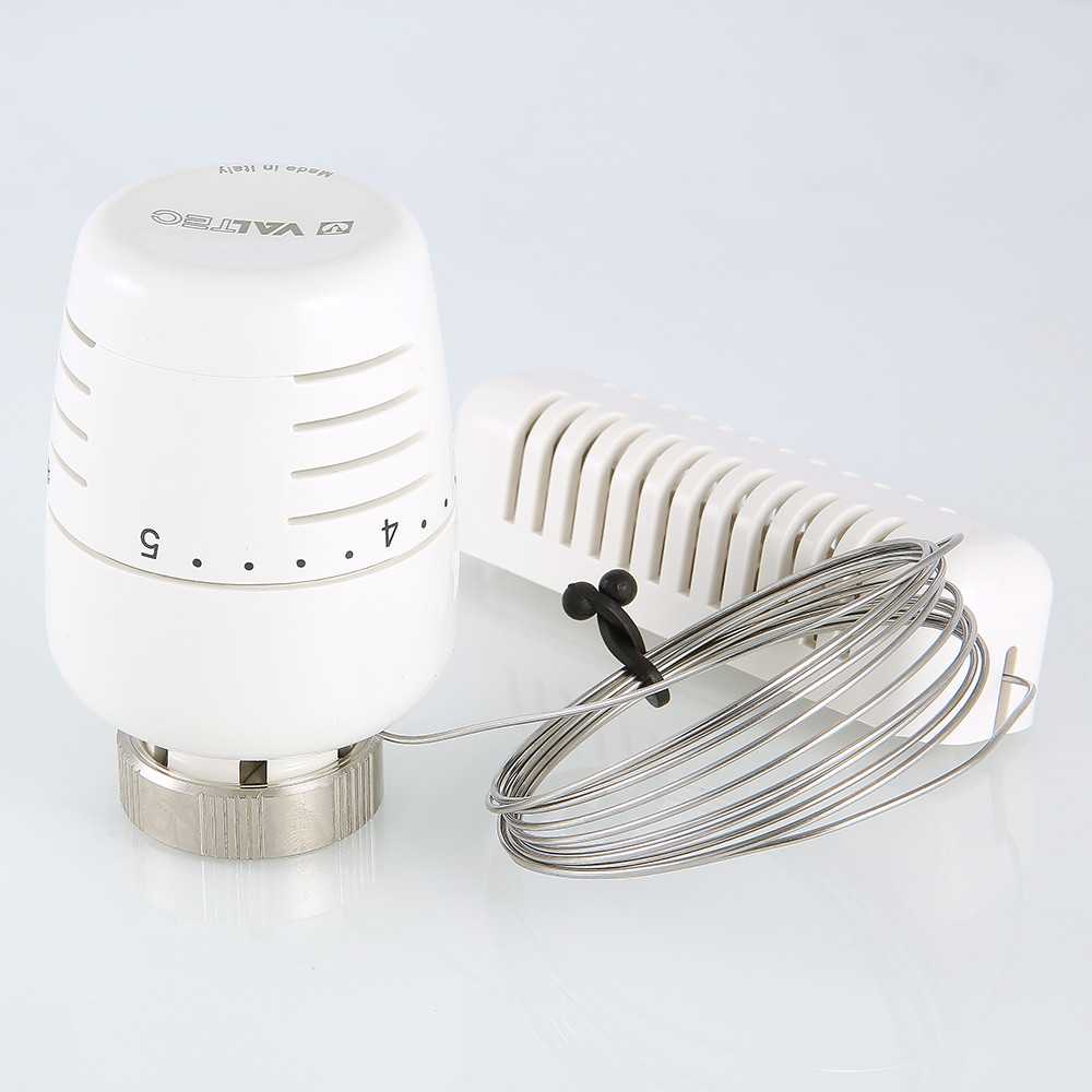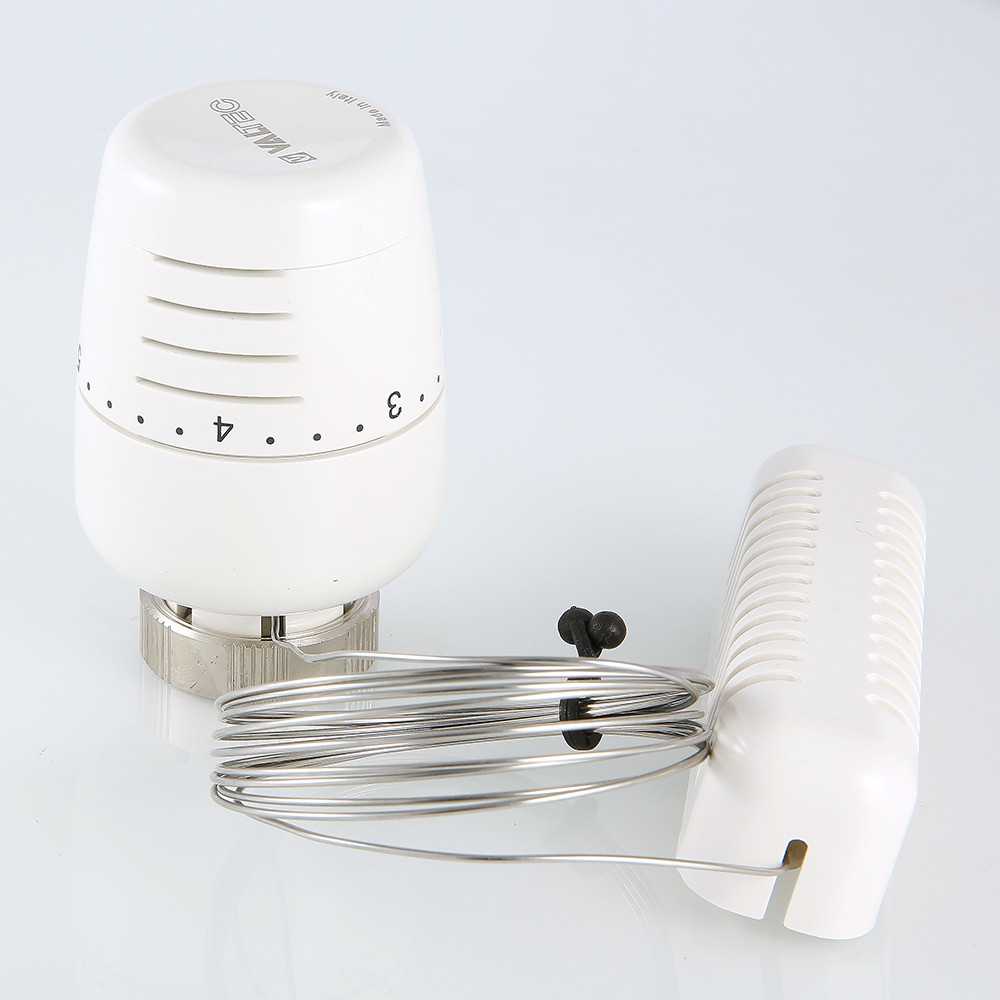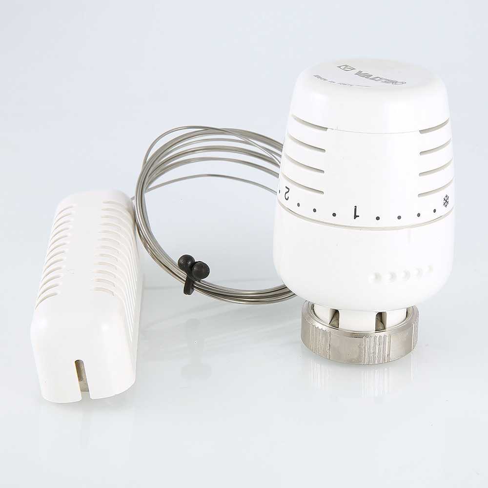 Термостатическая головка с выносным настенным датчиком предназначена для установки на регулирующий клапан радиатора, коллектора, монтажного узла VT.ICBOX. Чувствительный элемент термоголовки, наполненный толуолом и соединенный со встроенной сильфонной емкостью капиллярной трубкой длиной 2 м, монтируется на стену помещения вне зоны тепловых воздействий и сквозняков, что повышает точность поддержания температуры внутреннего воздуха. При ее изменении сильфон воздействует на шток клапана, управляя количеством протекающего теплоносителя.