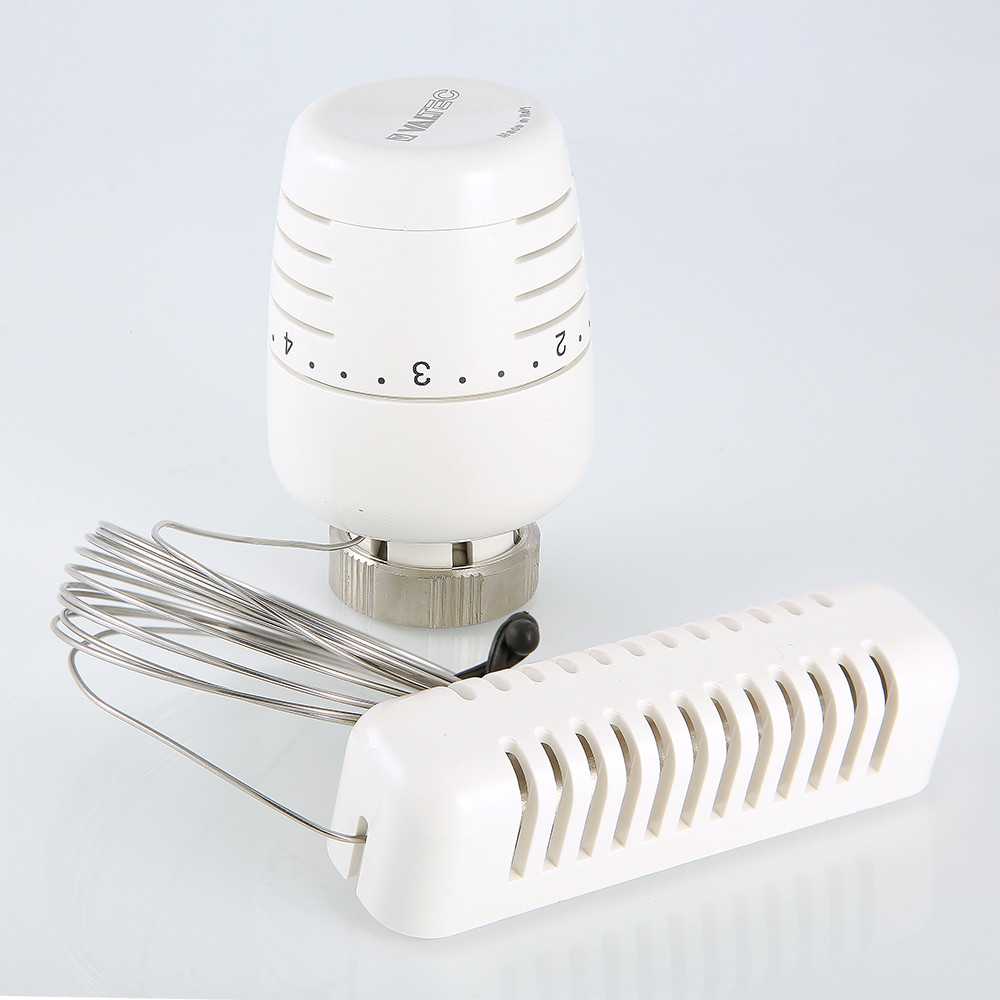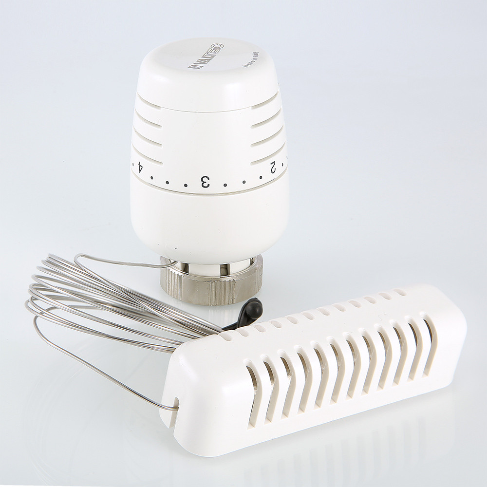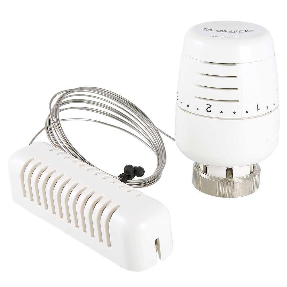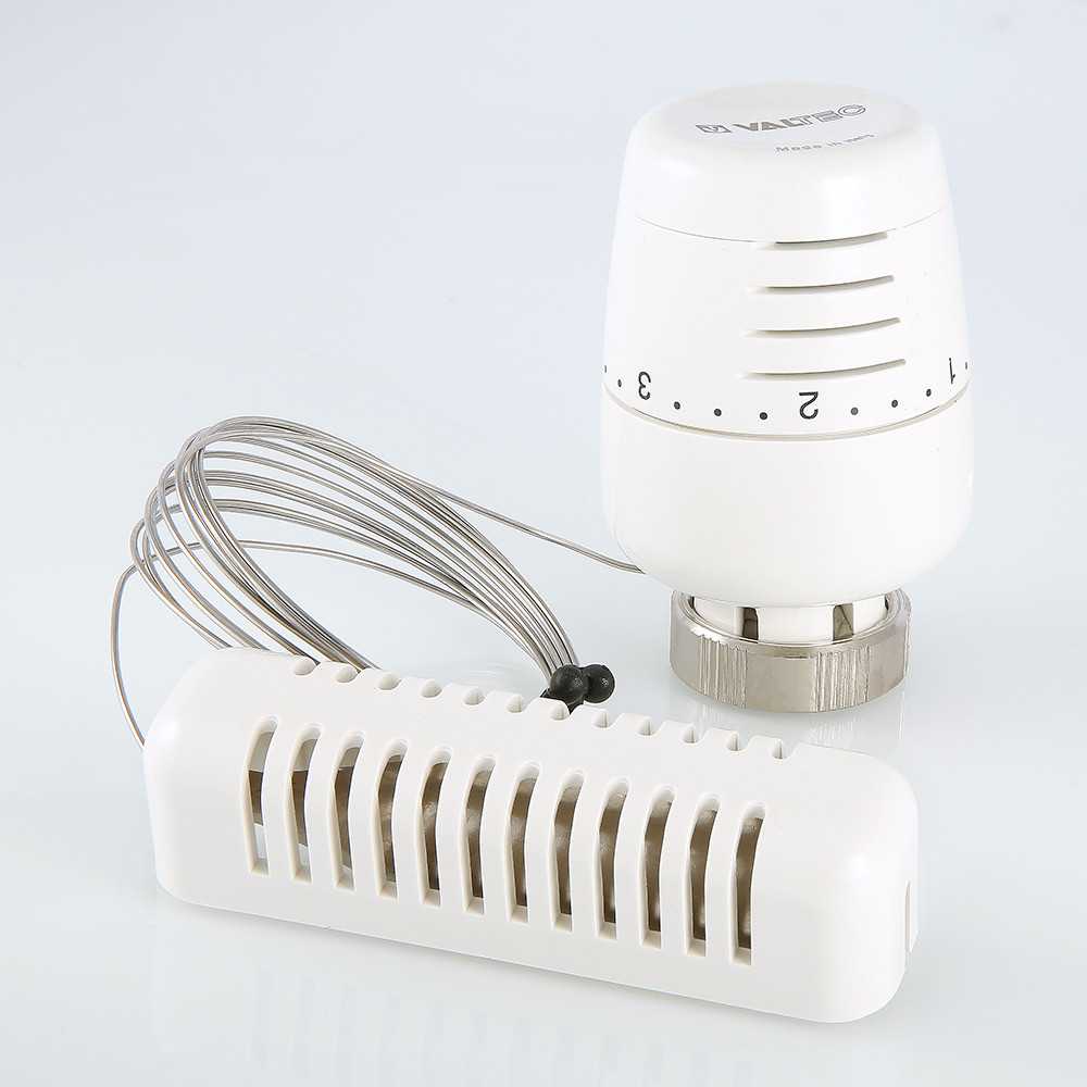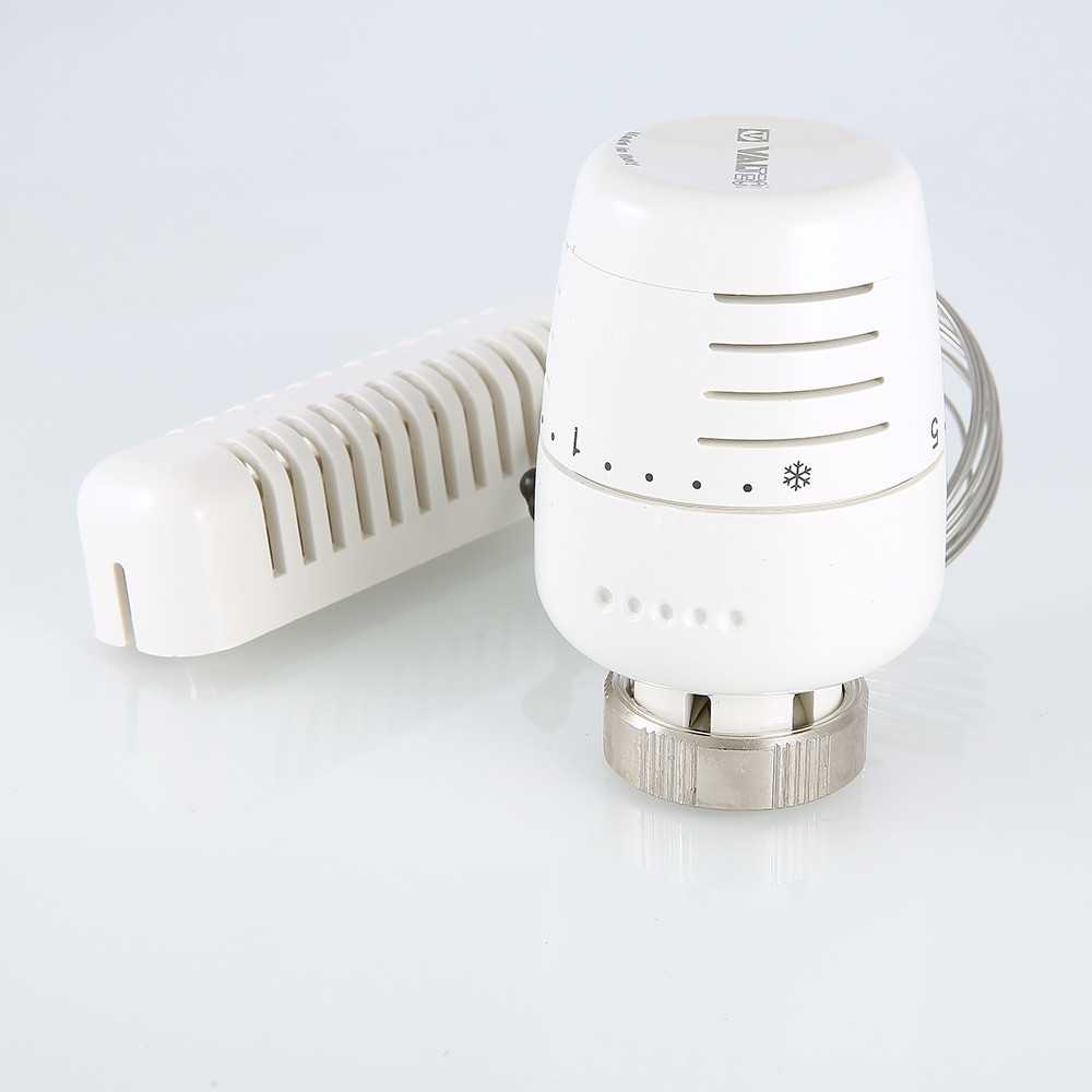 Термостатическая головка с выносным настенным датчиком предназначена для установки на регулирующий клапан радиатора, коллектора, монтажного узла VT.ICBOX. Чувствительный элемент термоголовки, наполненный толуолом и соединенный со встроенной сильфонной емкостью капиллярной трубкой длиной 2 м, монтируется на стену помещения вне зоны тепловых воздействий и сквозняков, что повышает точность поддержания температуры внутреннего воздуха. При ее изменении сильфон воздействует на шток клапана, управляя количеством протекающего теплоносителя.