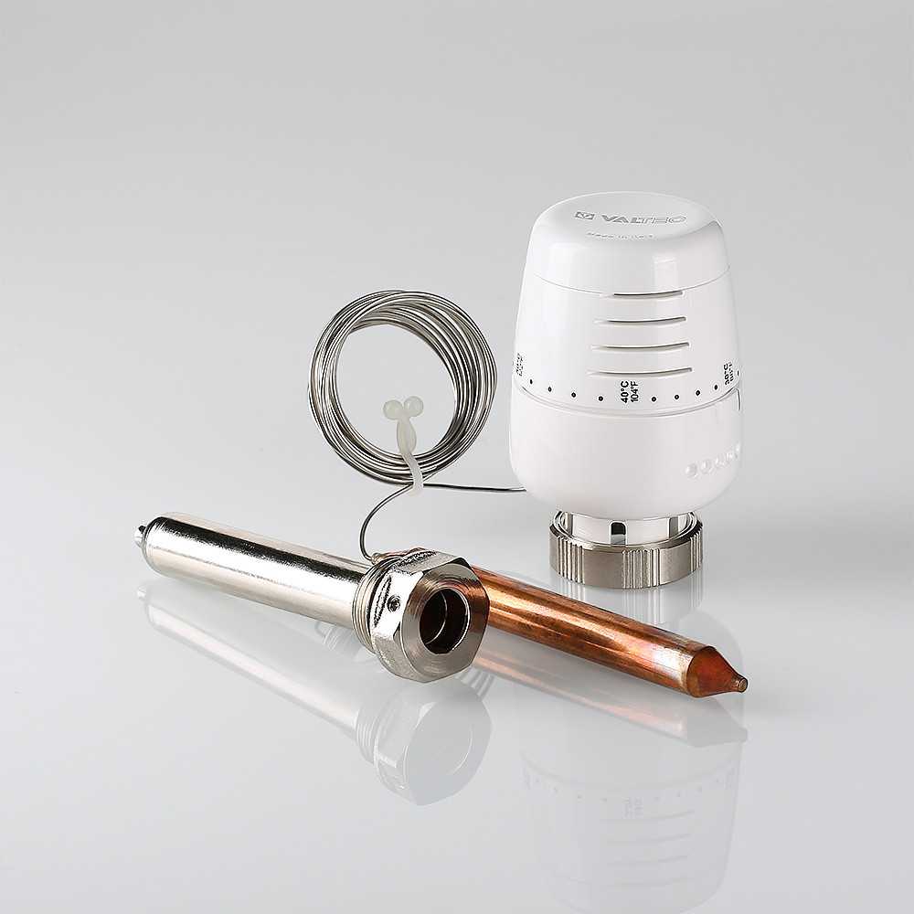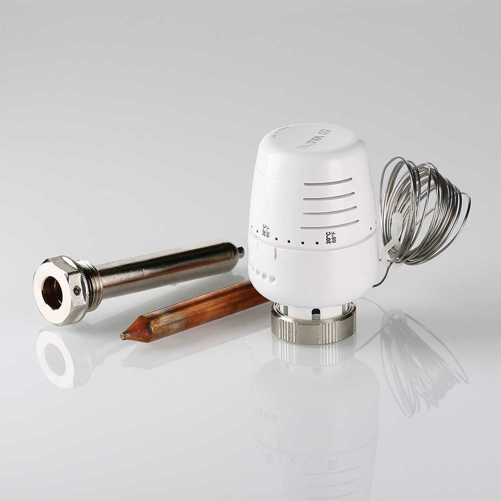 Термостатическая головка, соединенная медной капиллярной трубкой длиной 2 м с выносным погружным датчиком жидкостного типа. Диапазон регулирования – от 20 до 60 °C. Датчик устанавливают в латунную гильзу с наружной резьбой на 1/2". Головка применяется для управления термостатическим клапаном в составе насосно-смесительных узлов напольного отопления (теплый пол).