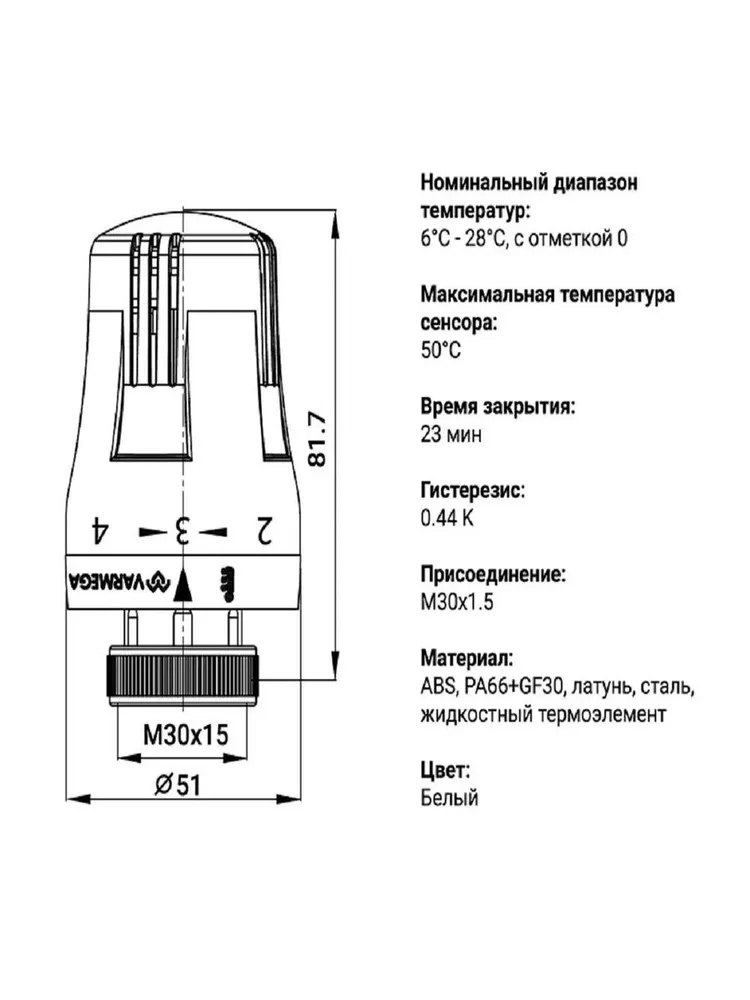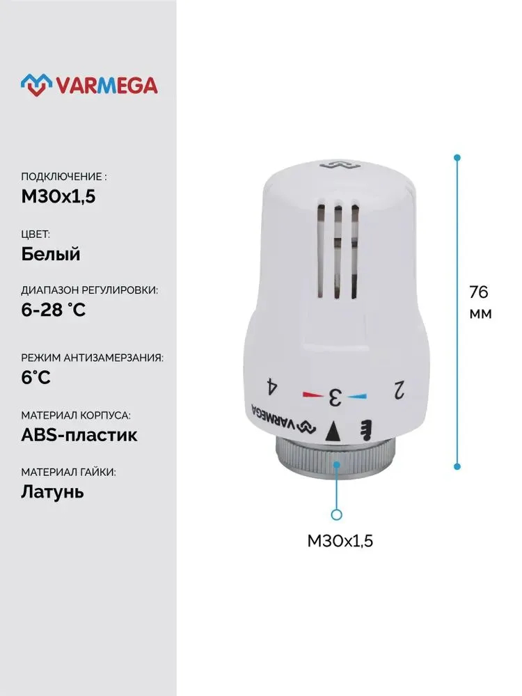 Термостатическая головка Varmega должна использоваться совместно с термостатическими клапанами, имеющими присоединительный размер М30х1.5. При этом не рекомендуется использовать регулирующий клапан и термоголовку разных производителей, так как длина хода штока может отличаться.