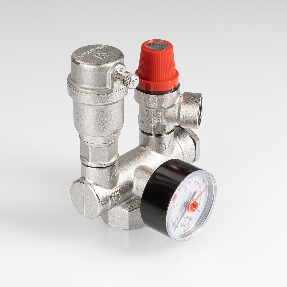 Комплектная группа безопасности для оснащения котлов и бойлеров систем автономного отопления, ГВС. Применяется в установках с тепловой мощностью до 44 кВт (определяется штатным предохранительным клапаном), номинальным давлением не выше 10 бар, рабочей температурой не более 120 °С. Допустимая рабочая среда – пар, вода, незамерзающий теплоноситель (максимальное содержание гликолей – 50 %). Состав изделия: предохранительный клапан (настройка – фиксированная, 3 бара), автоматический воздухоотводчик, манометр со шкалой 0–4 бар, латунный никелированный корпус. Предусмотрен резьбовой патрубок для подключения расширительного бака (диаметр – 3/4”). Группа безопасности котла монтируется на выходе теплогенератора. Резьба присоединения – внутренняя, 1”.