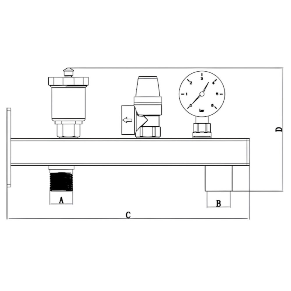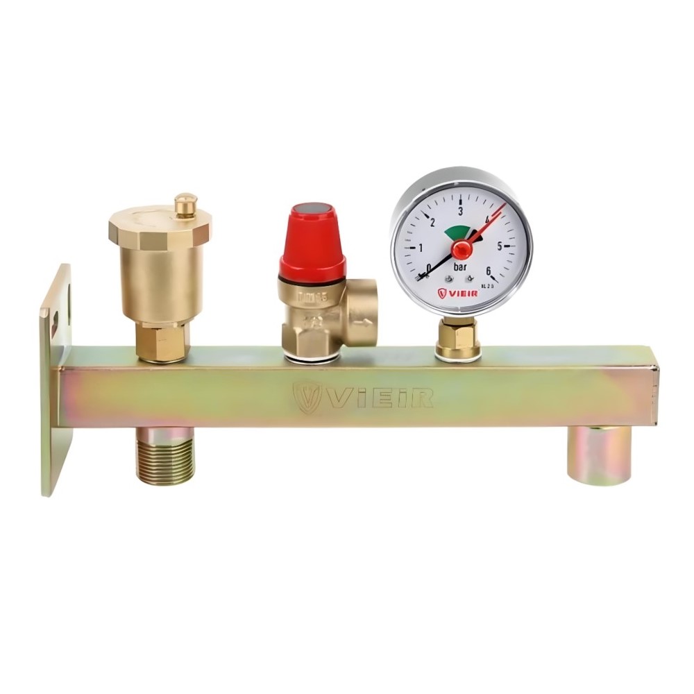 Группа безопасности комплектуется автоматическим поплавковым воздухоотводчиком, предохранительным клапаном и манометром. Группа безопасности имеет фланец для консольного крепления к стене.
