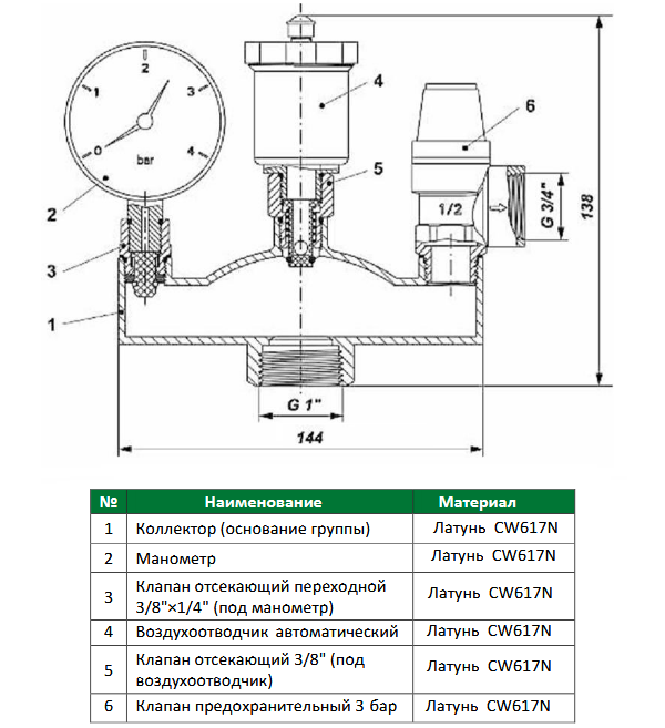 Воздух, собирающийся в верхней части коллектора, автоматически удаляется через воздухоотводчик. Наличие отсечного клапана под воздухоотводчиком позволяет обслуживать и заменять его без слива системы. Давление в системе контролируется по манометру