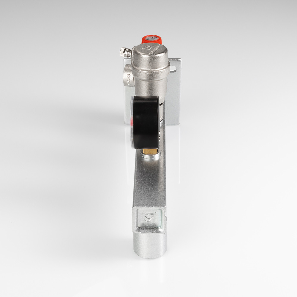 Группа безопасности стальная консольная (группа безопасности расширительного бака) представляет собой смонтированные на полой консоли из оцинкованной стали предохранительный клапан с фиксированной настойкой, автоматический воздухоотводчик, манометр со шкалой 0–4 бар. Консоль оборудована резьбовыми патрубками – присоединительным и для мембранного бака, фланцем настенного крепления. Непосредственно к группе допускается подвешивать «мембранник» объемом до 50 л. Оборудование рассчитано на применение в системах тепловой мощности до 44 кВт (увеличивается заменой предохранительного клапана), номинальное давлением – 10 бар, максимальная температура рабочей среды (вода, пар, незамерзающий теплоноситель с концентрацией гликоля не выше 50 %) – 120 °C. Функциями изделия являются защита системы отопления/ГВС от превышения давления, завоздушивания, индикация текущего значения давления, крепление мембранного бака.