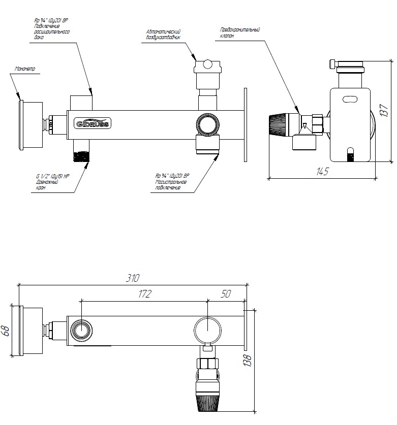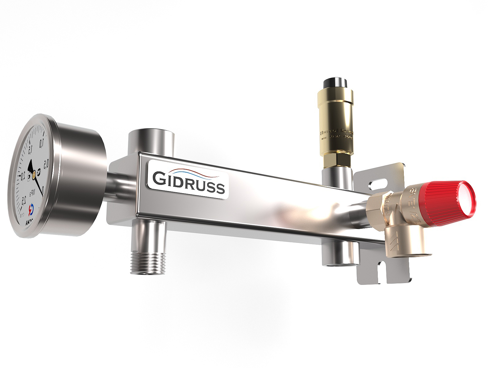 Группа безопасности расширительного бака консольная Gidruss BKSS-24U (бак до 8-24 л вверх, в к-те воздухо-отводчик, нерж. манометр, аварийный клапан 6