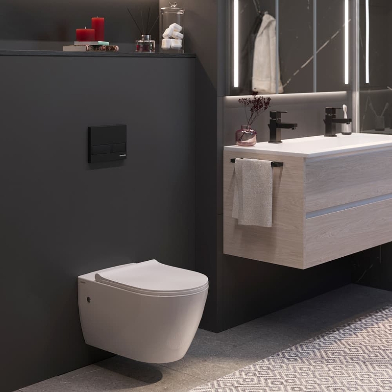 Комплект унитаза Berges Wasserhaus Novum Rimless 043217 с инсталляцией Novum 525 с сиденьем Toma SO Микролифт и Черной клавишей смыва L5 Soft Touch.