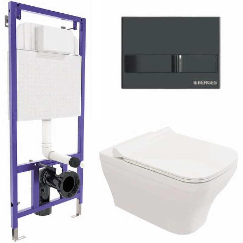 Комплект унитаза с инсталляцией Berges Wasserhaus Novum 042454 с сиденьем Микролифт и Черной глянцевой клавишей смыва.