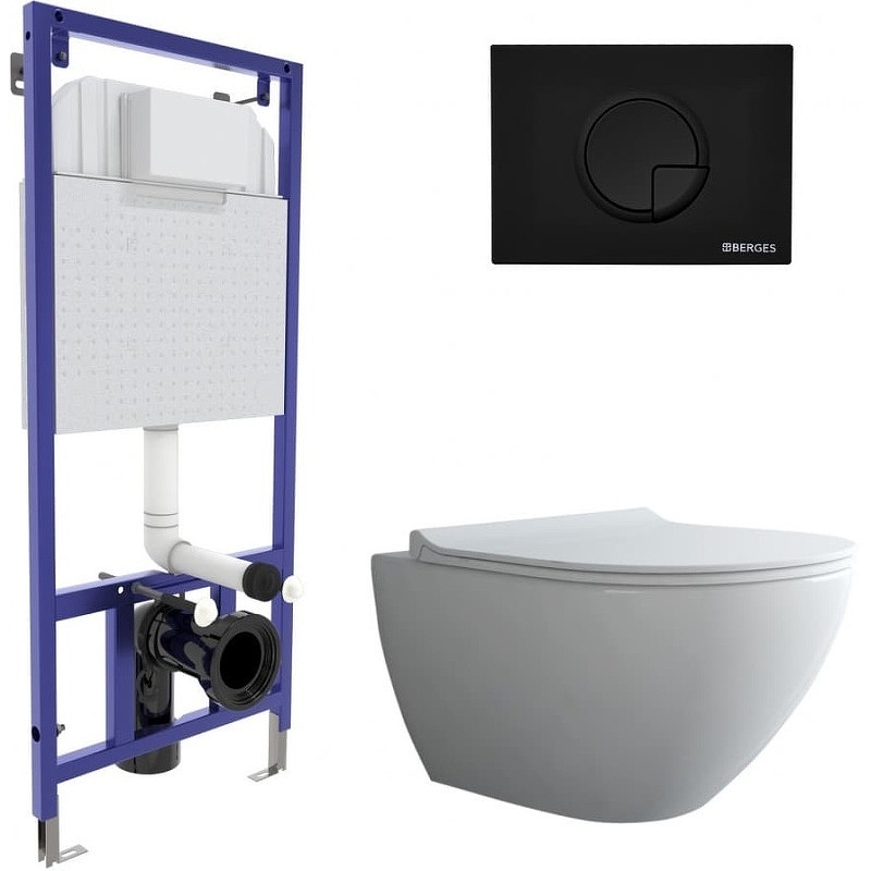 Комплект унитаза Berges Wasserhaus Novum Rimless 043268 с инсталляцией Novum 525 с сиденьем Toma SO Микролифт и Черной клавишей смыва R5 SoftTouch.