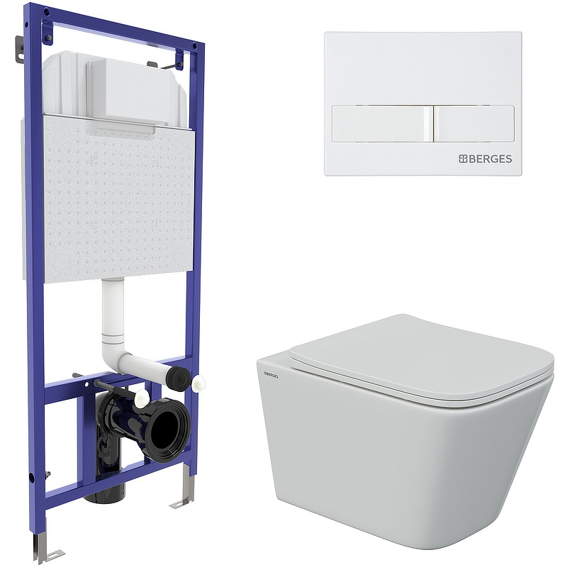Комплект унитаза с инсталляцией Berges Novum 043244 с сиденьем Микролифт и Белой клавишей смыва.