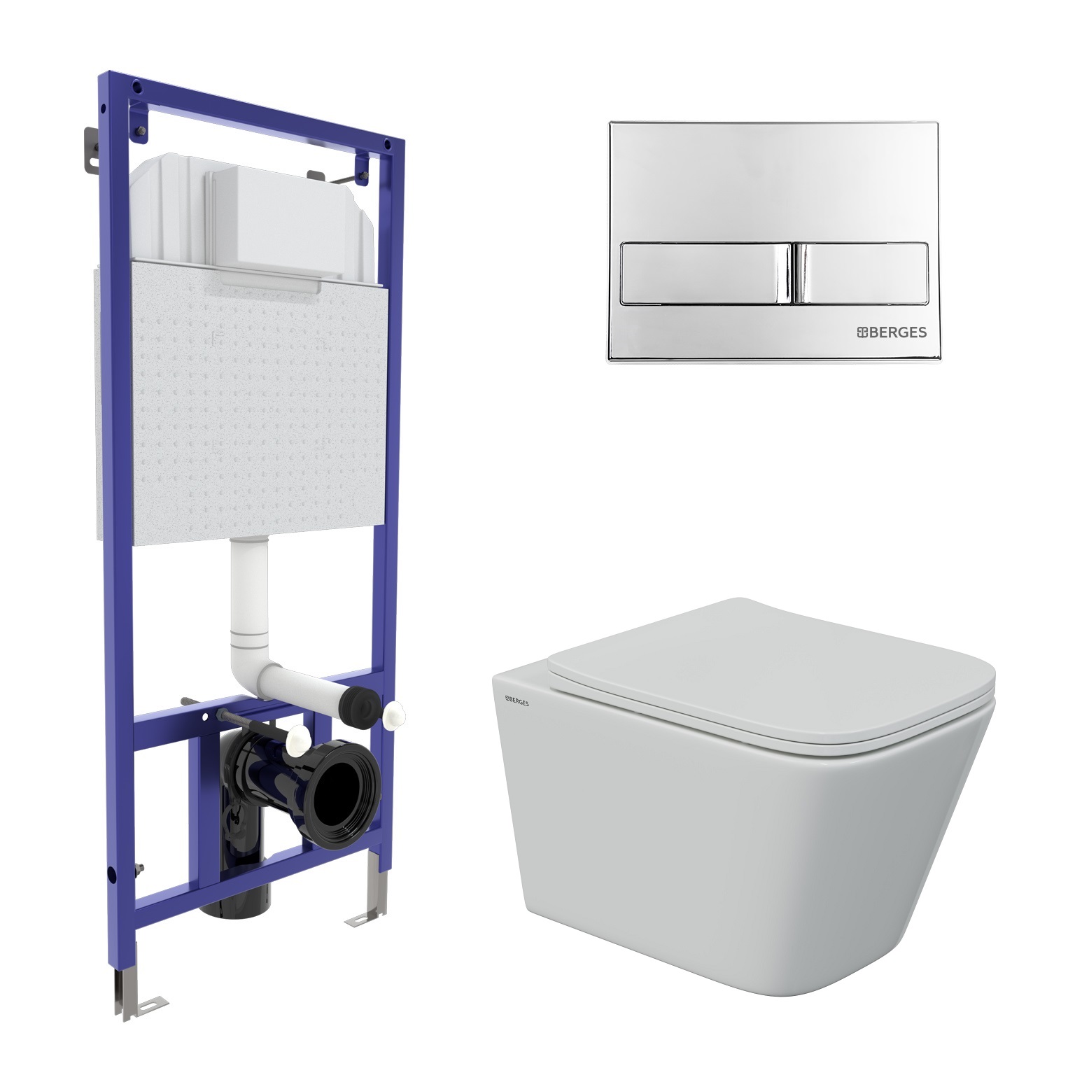 Комплект инсталляция с унитазом Berges Novum525 c с кнопкой L3 хром глянец, унитаз FLOE S Rimless, сиденье Floe S Slim SO (043242)