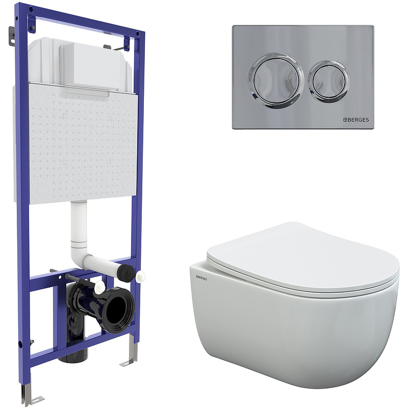 Комплект унитаза с инсталляцией Berges Novum 04324 с сиденьем Микролифт и клавишей смыва Хром глянцевый.