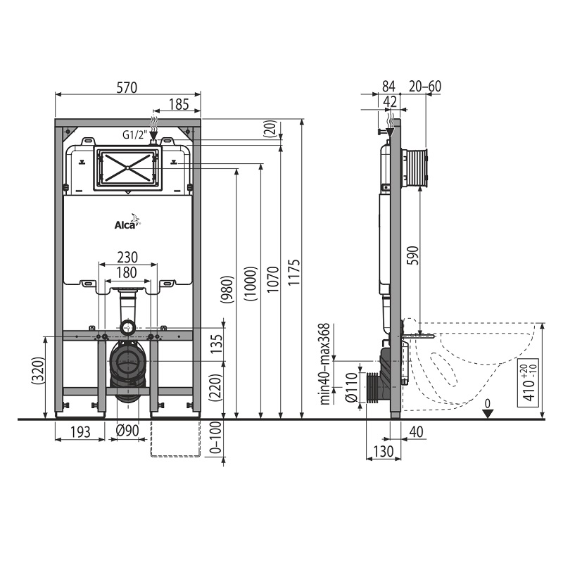 Скрытая система инсталляции для сухой установки (для гипсокартона). Для монтажа к несущей стене или в гипсокартонную конструкцию, глубина монтажа - 84 мм. Для установки подвесного унитаза с интервалом крепления 180 мм или 230 мм. Для пола с толщиной стяжки 0-100. Для подвесных унитазов. Двойной смыв с гигиенических резервом. Совместим со всеми кнопками управления Alcaplast, за исключением сенсорных кнопок. Технические параметры: Рекомендуемый диапазон давления воды 0,3 0,5 MPa. Рабочий диапазон давления воды 0,05 0,8 MPa. Гигиенический резерв 3 l. Объем воды в бачке 9 l. Подвод воды к задней стенке бачка или сверху бачка осуществляется с помощью монтажных отверстий G1/2 . Стандартные настройки малого смыва 3 l. Стандартные настройки большого смыва 6 l. Несущая способность 400 kg.