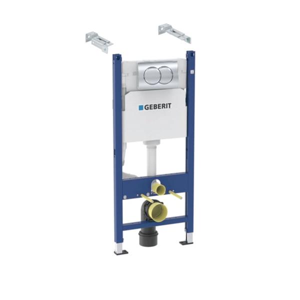 Система инсталляции Geberit Duofix Delta (артикул 458.149.21.2) представляет собой готовый комплект «3 в 1», включающий в себя монтажную раму стандартной высоты, скрытый бачок и клавишу смыва Delta 21 в цвете глянцевый хром. Это универсальное и экономичное решение для установки подвесного унитаза.