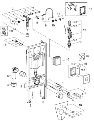 Самонесущая стальная рама с порошковым напылением подготовлена для облицовки. Фиксированные подключения, быстрая регулировка по высоте, крепежный материал. 2 болта-держателя для унитаза, крепление для керамики. Расстояние между болтами 180/230 мм, выходной патрубок для унитаза диаметром 90 мм, редуктор диаметром 90/110 мм. Подключение для впуска и впускной гарнитур. Объем смывного бачка (GD 2): 6/9 л. Пневматический смывной клапан с тремя режимами слива: 2-х объмный, старт/стоп, непрерывный. Управление спереди и сверху. Подключение воды слева, справа и сзади. Изоляция от конденсационной влаги. Клавиша смыва. Хромированное покрытие Grohe StarLight гарантирует длительную износостойкость без царапин с сияющей чистотой. 2 объема смыва или прерывание смыва старт/стоп. Поворотный держатель с фиксацией по высоте. Для пневматического смывного клапана. Вертикальный монтаж, 15,6x19,7 см, из ABS. Настенный крепеж. Бесступенчатая регулировка глубины от 130 - 203 мм. Облицовка для одиночного или рельсового монтажа. Крепежный материал. Шумоизоляция. Звукоизоляционная панель для унитаза.