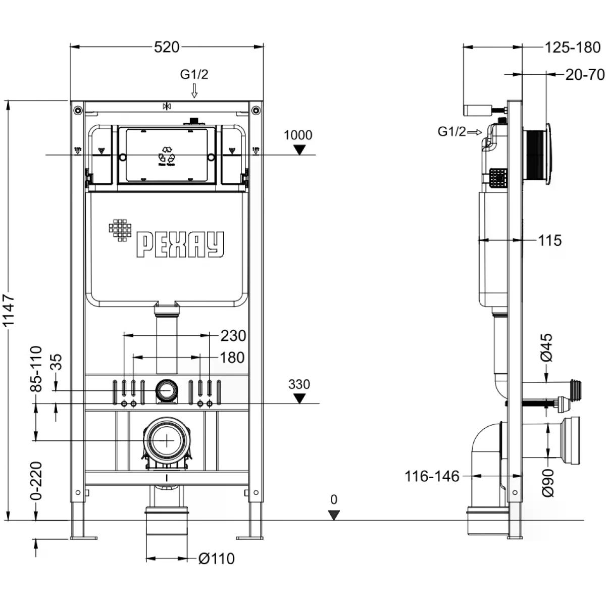 - Минимальное расстояние от стены до инсталляции РЕХАУ NOVAFLOW 135 мм