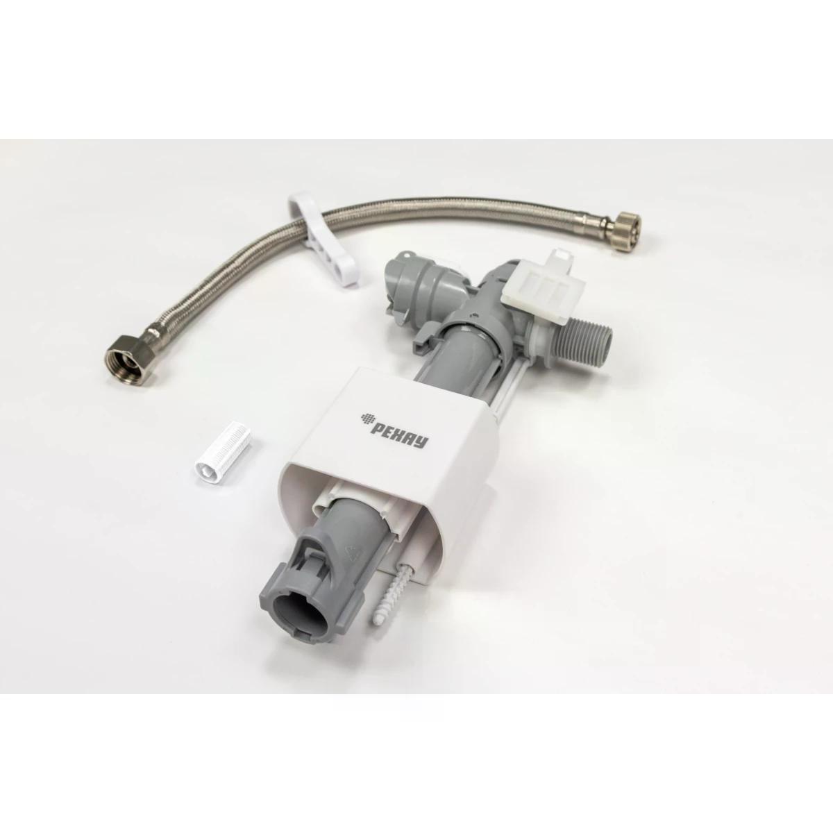 - Предварительно собранный бачок, включающий в себя: клапаны слива и залива, латунный вентиль наполнения бачка, корзина сливного клапана с настраиваемым редуктором смыва для предотвращения разбрызгивания воды из чаши унитаза, съемный гибкий шланг заливного клапана, механизм активации смыва