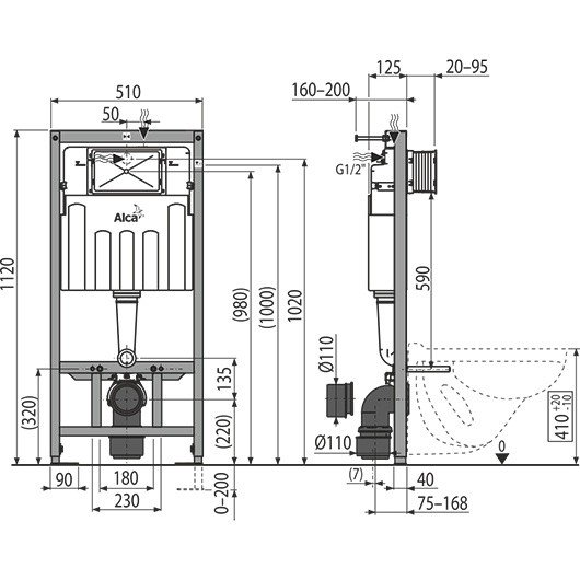 Для установки подвесного унитаза с интервалом крепления 180 мм или 230 мм. Для пола с толщиной стяжки 0-200 мм. В данной инсталляции смонтирован модернизированный вентиль подачи воды производства Alca Plast. Регулируемые выдвижные ножки в диапазоне 0–200 мм с тормозной системой. Подвижной держатель для стокового колена, устанавливаемый в восьми положениях на расстоянии 0–93 мм. Конструкция рамы позволяет производить монтаж к профилю для гипсокартона, предназначенного для этих целей, или к несущей стене. Установленная система закрывается гипсокартонным листом и не нуждается в дополнительных крепежных элементах. Конструкция полистирольной изоляции предотвращает процесс конденсации на поверхности бачка и ослабляет вибрацию в строительной конструкции. Возможность установки кронштейна с переходом DG 1/2" для подключения сиденья-биде или бидетты. Двойной смыв, независимо регулируемый, с гигиеническим резервом. Подходит для установки пневматического или сенсорного смыва. Совместима со всеми кнопками управления Alcaplast. Бачок сделан из одного фрагмента полипропилена, что обеспечивает его 100% герметичность.