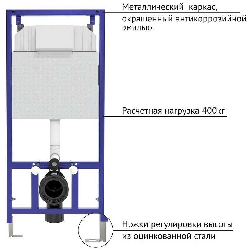 Металлический каркас, окрашенный антикоррозийной эмалью. Расчетная нагрузка 400кг. Толщина бачка 80мм. Подходит для установки в малогабаритных помещениях. Объём резервуара воды 10 л с тепло- и шумоизоляцией. При давлении 3-5 бар уровень шума от 13 до 18 дБ. Подвод воды сверху (G1/2 наружная). Объем смыва 3/6 литра с возможностью регулировки. Управление механическое, две кнопки. Межосевое расстояние под шпильки для подвеса унитаза 18 и 23 см. Ножки регулировки высоты из оцинкованной стали. Полный комплект для быстрой установки. Материал панели смыва: ABS пластик, ударопрочный, стойкий к щелочам и моющим средствам, влагостойкий, долговечный. Клавиша с покрытием Soft Touch (материал матовый, приятный на ощупь и устойчивый к царапинам).