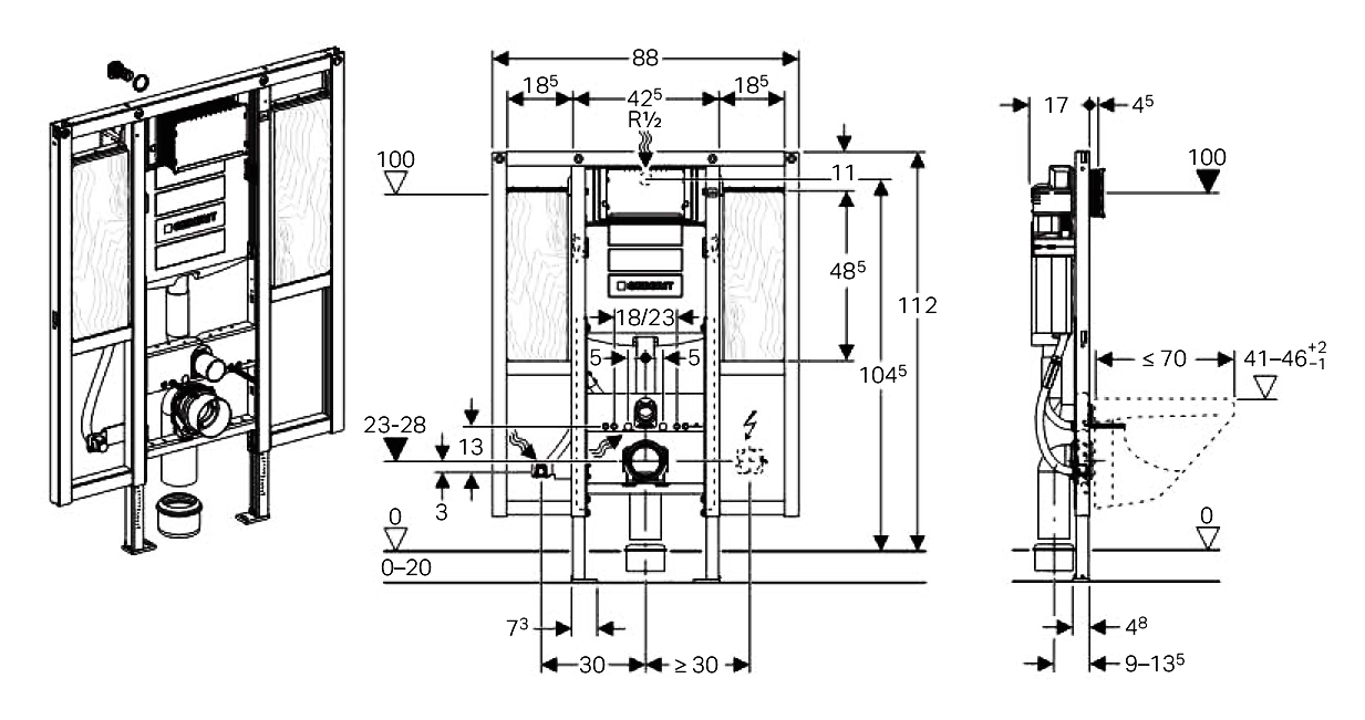 Метод крепления: в капитальную стену, в некапитальную стену, в пол. Подходит для лиц с ограниченными возможностями, для поручней и опор. Самонесущая pама с порошковой окраской. Рама подготовлена для крепления крепежных скоб для установки нестандартного санфаянса. Регулируемая высота установки унитаза на этапе основных строительных работ, 41–46 см. Стойка оцинкованная. Стойки с возможностью перемещения 0–20 см. Стойки с защитой от скольжения. Опорные площадки поворотные. Глубина опорных площадок подходит для монтажа в U-образные профили UW 50 и UW 75 и в направляющие системы Geberit Duofix. Соединительное колено может монтироваться на различной глубине без использования инструментов, диапазон смещения – 45 мм. Крепление соединительного колена шумопоглощающее. Смывной бачок скрытого монтажа с фронтальной установкой. Смывной бачок скрытого монтажа с противоконденсатной изоляцией. При заводской установке возможен немедленный последующий смыв. Монтаж и сервисное обслуживание смывного бачка скрытого монтажа не требуют использования инструментов. Подвод воды сзади или сверху по центру. Защитная крышка окна технического обслуживания защищает от влаги и грязи. Защитная крышка окна технического обслуживания с возможностью укорачивания. Опорная площадка из фанерованного дерева, водонепроницаемая склейка. Класс материалов B2 согласно стандарту DIN 4102-1 или класс D-s2, d0 согласно DIN EN 13501-3. Содержание формальдегида: класс A согласно стандарту EN 1084 или класс E 1 согласно EN 13936. Оснащен трубкой подвода воды для подсоединения унитазов-биде Geberit AquaClean. С возможностью крепления для электропитания. Для клавиш Sigma.