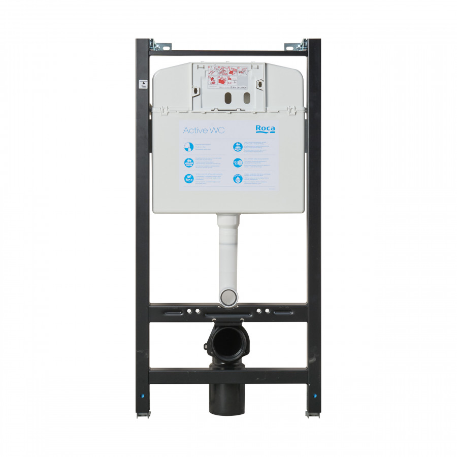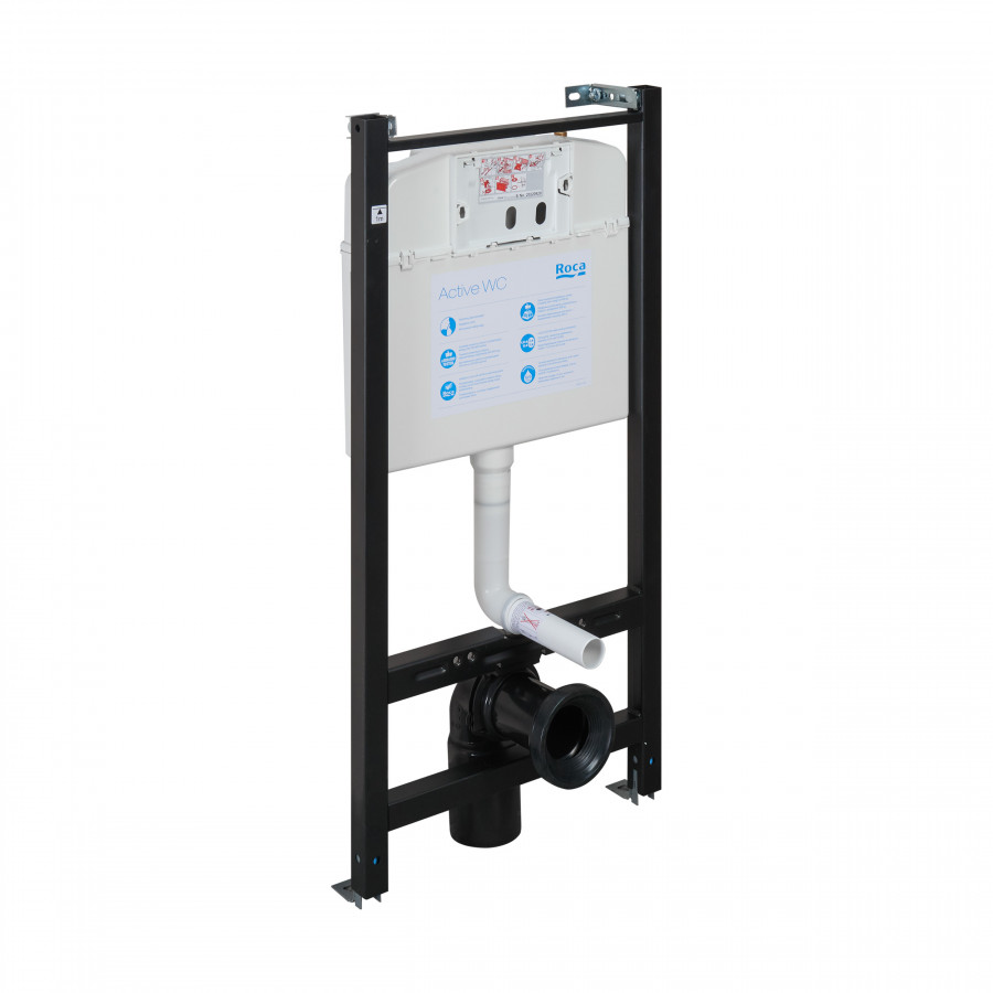 Инсталляционная система Roca Active для унитазов с межосевым расстоянием 180 и 230 мм. Надежная рама из стального профиля 40х40 мм покрыта порошковым антикоррозийным покрытием. Ножки регулируются по высоте. Бачок защищен от шума и конденсата. Подвод воды сверху посередине/справа. Объем смыва по умолчанию настроен на 6/3 л.