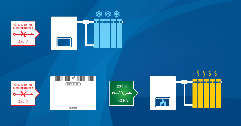 TEPLOCOM-250+ предназначен для электроснабжения газовых настенных котлов индивидуального отопления с открытой и закрытой камерой сгорания мощностью до 250 ВА. Изделие обеспечивает отопительное оборудование качественным электропитанием, защищает его от сетевых неполадок, предотвращает выход оборудования из строя. Чистый синус. Автоматический переход на резервное питание от АКБ при пропадании сети, работает от одного АКБ 12 В, защита АКБ от глубокого разряда, оптимальный заряд АКБ, установка АКБ до 40 Ач внутри корпуса, модуль зануления для корректной работы котла в режиме резерва, защита от перегрузки, индикация режимов работы, настенная или настольная установка. Разработан с учетом специфики работы настенных газовых котлов. В TEPLOCOM-250+ реализована уникальная функция — РЕЖИМ ПРОДЛЕНИЯ ВРЕМЕНИ РЕЗЕРВА, которая позволяет существенно увеличить время резервной работы котла благодаря экономии ресурса АКБ, за счет цикличного питания нагрузки в режиме РЕЗЕРВ.