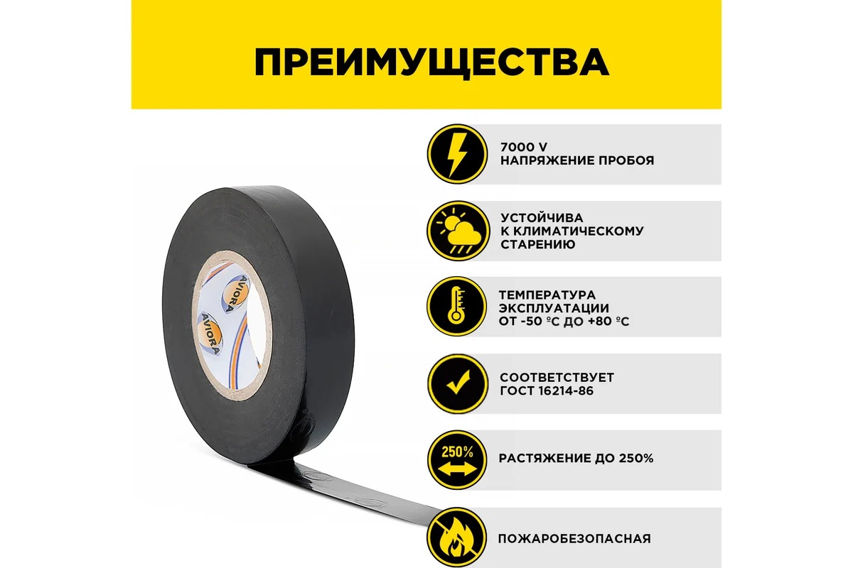 Материал ПВХ и входящие в его состав добавки придают изоляционной ленте AVIORA высокую эластичность, устойчивость к воздействию внешних факторов и прочность.