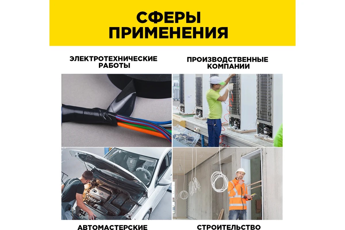 Подходит для всех видов электромонтажных работ: электроизоляция проводов, сращивание и жгутирование, цветовая маркировка, крепление различных материалов, защита от повреждений.
