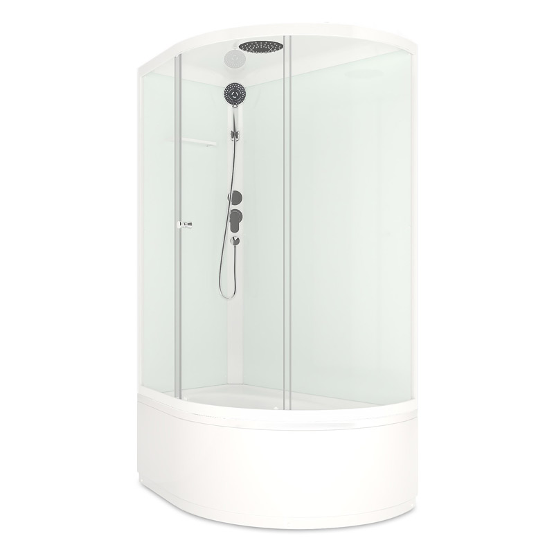 Высокий поддон. В комплекте смеситель, верхний душ и ручной душ на гибком шланге. Полочка для ванных принадлежностей.