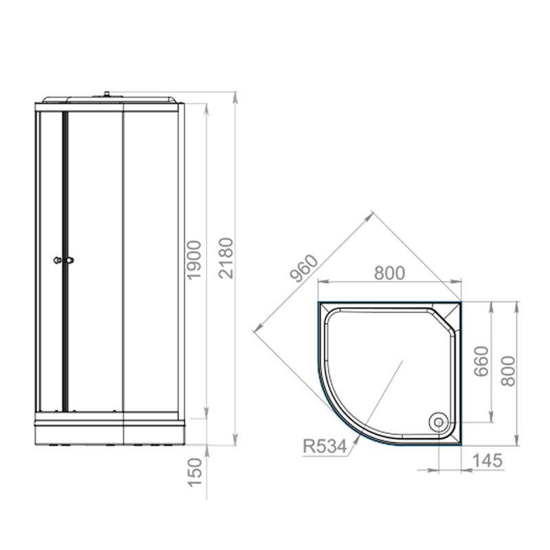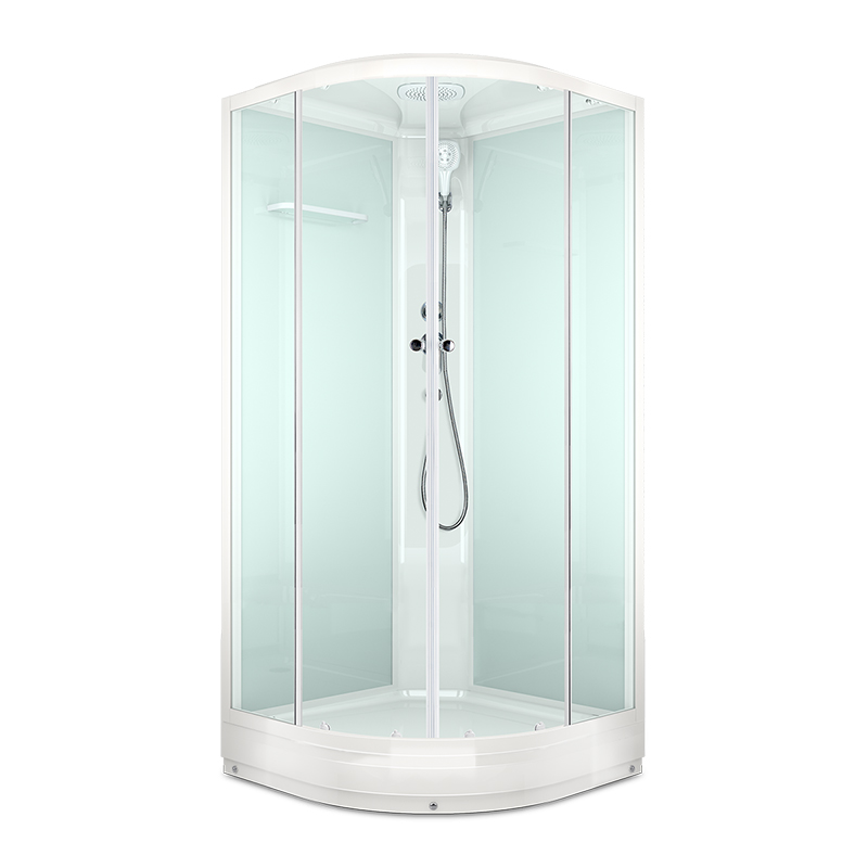 Угловая душевая кабина со стекляными прозрачными дверцами и белыми стенками и профилем. Низкий поддон. Открытие и закрытие двери одной рукой. В комплекте смеситель, верхний душ и ручной душ на гибком шланге. Полочка для ванных принадлежностей. Душевая кабина укомплектована сливными кнопками с системой забора волос и другого мусора, что позволяет сократить денежные расходы, связанные с чисткой или заменой канализации. Поддон усилен сплошной плитой ДСП 16 мм. Поддон, стенки и крыша изготовлены из прочного санитарного акрила. Завод находится в России и разработал уникальную конструкцию профиля, благодаря которой, горизонтальный профиль ложится не рядом с бортиком, а на бортик, и не имеет движения по поддону, что обеспечивает жесткость конструкции, а отсутствие зазора между профилем и бортом препятствует скоплению трудноизвлекаемой грязи. Формы деталей для душевых кабин изготавливаются на станках ЧПУ, что дает деталям стыковаться друг с другом без малейших зазоров.