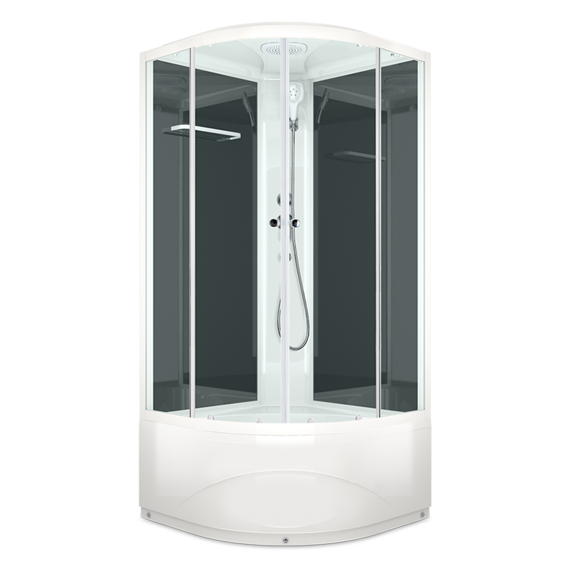 Угловая душевая кабина со стекляными прозрачными дверцами, и черными стенками и белым профилем. Высокий поддон. Открытие и закрытие двери одной рукой. В комплекте смеситель, верхний душ и ручной душ на гибком шланге. Полочка для ванных принадлежностей. Душевая кабина укомплектована сливными кнопками с системой забора волос и другого мусора, что позволяет сократить денежные расходы, связанные с чисткой или заменой канализации. Поддон усилен сплошной плитой ДСП 16 мм. Поддон, стенки и крыша изготовлены из прочного санитарного акрила. Завод находится в России и разработал уникальную конструкцию профиля, благодаря которой, горизонтальный профиль ложится не рядом с бортиком, а на бортик, и не имеет движения по поддону, что обеспечивает жесткость конструкции, а отсутствие зазора между профилем и бортом препятствует скоплению трудноизвлекаемой грязи. Формы деталей для душевых кабин изготавливаются на станках ЧПУ, что дает деталям стыковаться друг с другом без малейших зазоров.