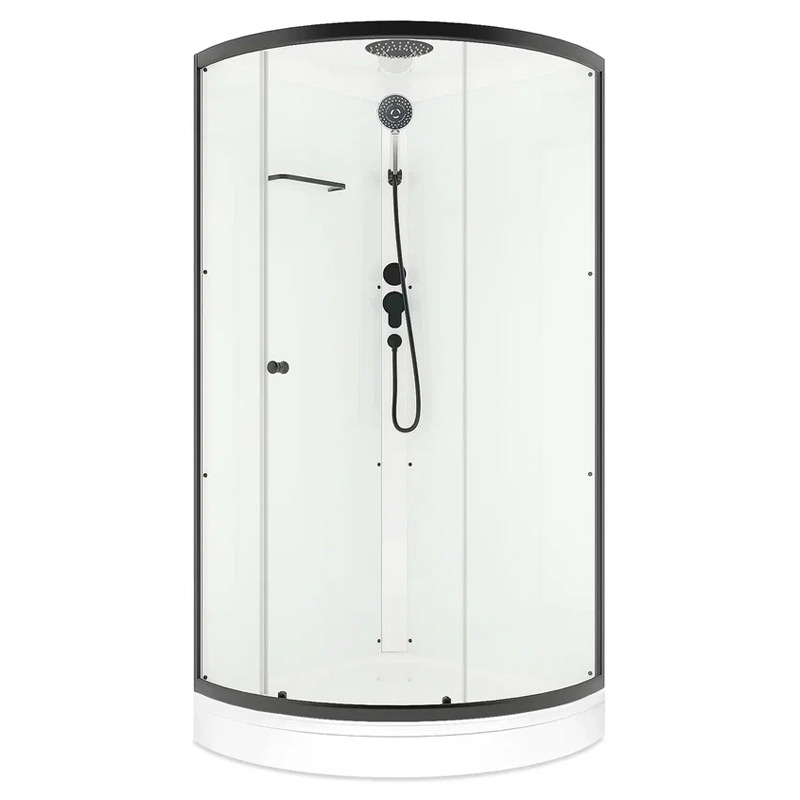 Душевая кабина со стекляными прозрачными дверцами и белыми стенками и графитовым профилем. Низкий поддон. Открытие и закрытие двери одной рукой. В комплекте смеситель, верхний душ и ручной душ на гибком шланге. Полочка для ванных принадлежностей. Кабина укомплектована сливными кнопками с системой забора волос и другого мусора. Поддон усилен сплошной плитой ДСП 16 мм. Поддон, стенки и крыша изготовлены из прочного санитарного акрила. Завод находится в России и разработал уникальную конструкцию профиля, благодаря которой, горизонтальный профиль ложится не рядом с бортиком, а на бортик, и не имеет движения по поддону, что обеспечивает жесткость конструкции, а отсутствие зазора между профилем и бортом препятствует скоплению трудноизвлекаемой грязи. Используются экологичные материалы высокого качества. Все кабины укомплектованы усиленными двойными верхними роликами и нижними роликами с пружиной. В комплекте сифон с гидрозатвором, что не позволяет распространяться неприятным запахам.