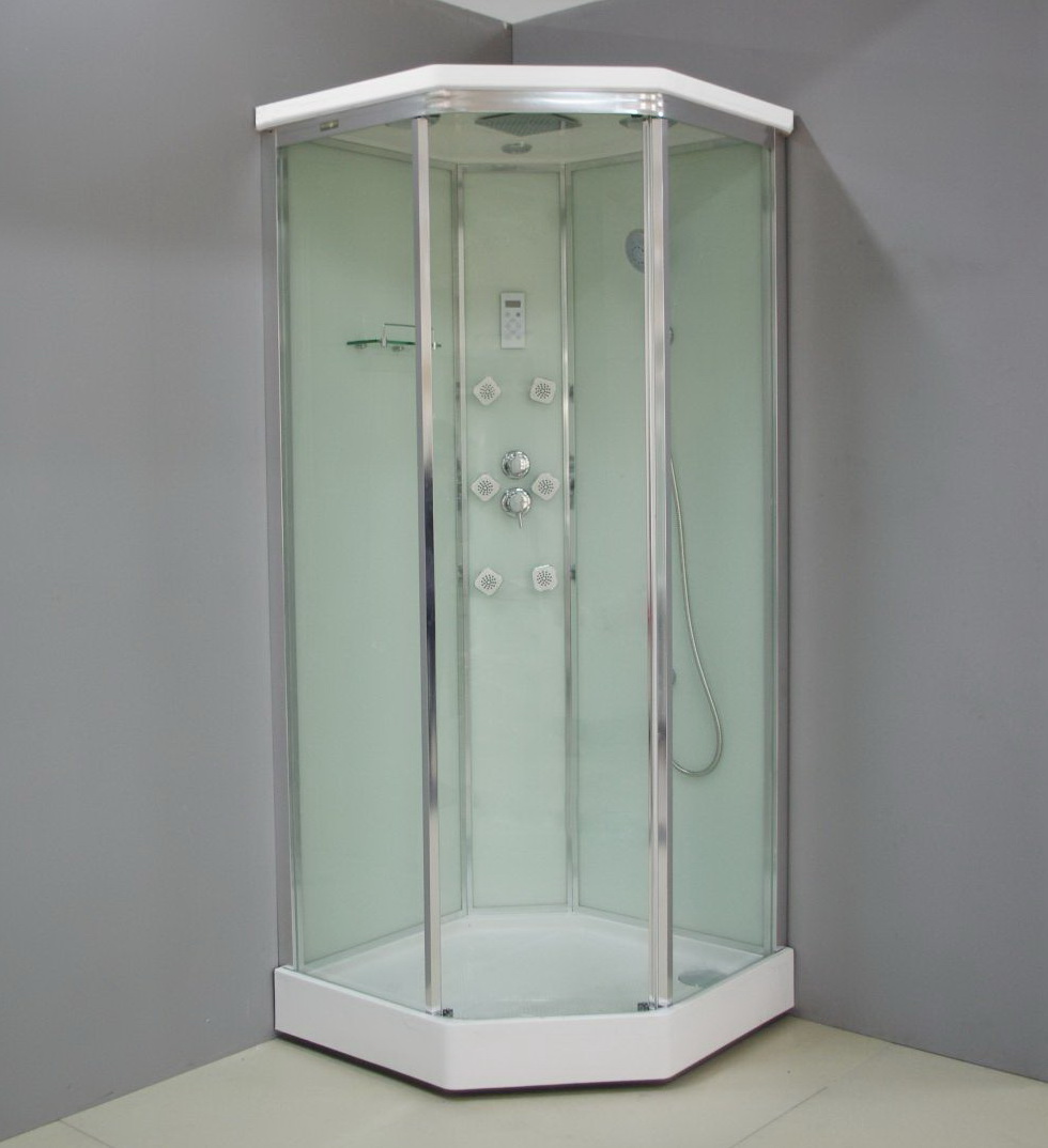 Низкий поддон. Стеклянные задние стенки, полочка для шампуня, поддон с устройством слива, смеситель с 3-х позиционным дивертером, душевая насадка, гидромассаж 6 форсунок, «Тропический дождь»
