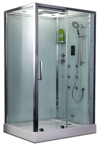 Стеклянные задние стенки и купол, полочка для шампуня, поддон с водозащитным бортиком и устройством слива, смеситель с 3-х позиционным дивертером душевой стойкой и душевой насадкой, гидромассаж 6 форсунок, «Тропический дождь», многофункциональная «Турецкая Баня», сенсорный пульт «TouchScreen» для управления всеми электронными компонентами, Пульт дистанционного управления, Подсветка, Радио, «Вентилятор», система «Easy Sliding-Rollers».