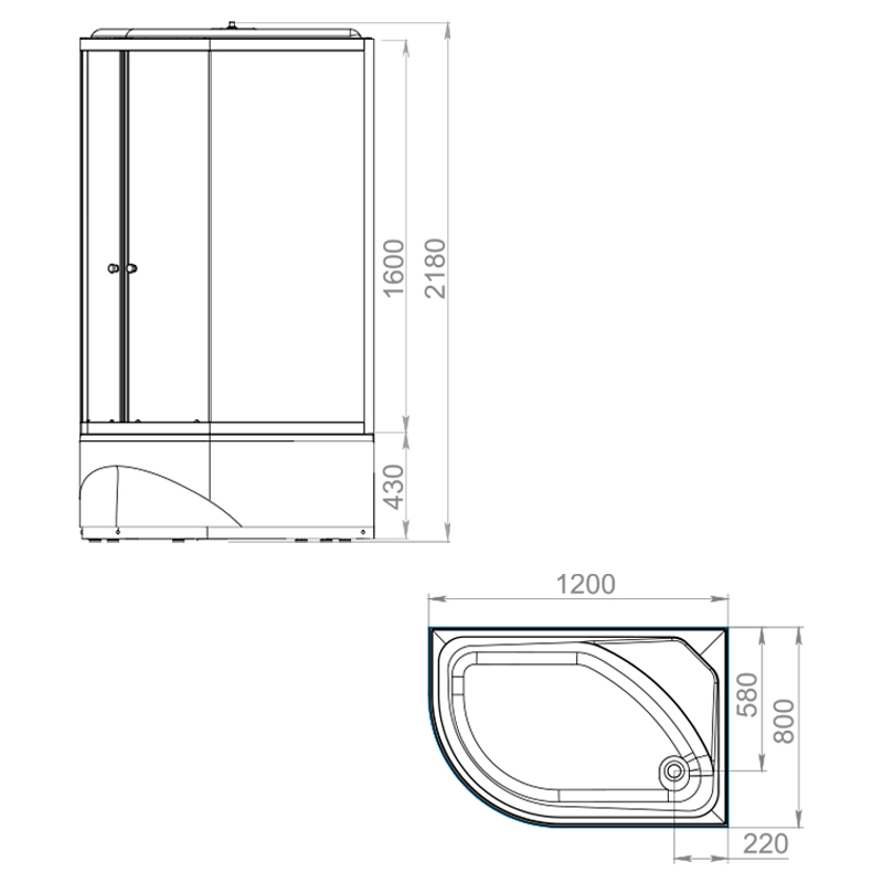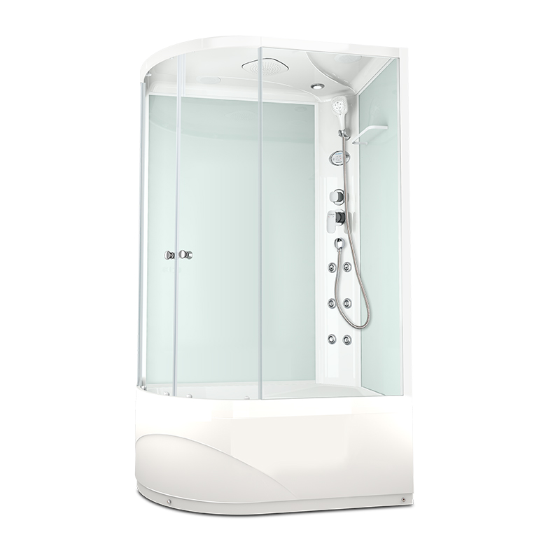 Ассиметричная душевая кабина со стекляными прозрачными дверцами и белыми стенками и профилем. Высокий поддон. Открытие и закрытие двери одной рукой. В комплекте смеситель, верхний душ и ручной душ на гибком шланге. Полочка для ванных принадлежностей. Душевая кабина укомплектована сливными кнопками с системой забора волос и другого мусора, что позволяет сократить денежные расходы, связанные с чисткой или заменой канализации. Поддон усилен сплошной плитой ДСП 16 мм. Поддон, стенки и крыша изготовлены из прочного санитарного акрила. Завод находится в России и разработал уникальную конструкцию профиля, благодаря которой, горизонтальный профиль ложится не рядом с бортиком, а на бортик, и не имеет движения по поддону, что обеспечивает жесткость конструкции, а отсутствие зазора между профилем и бортом препятствует скоплению трудноизвлекаемой грязи. Формы деталей для душевых кабин изготавливаются на станках ЧПУ, что дает деталям стыковаться друг с другом без малейших зазоров.