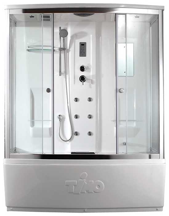 Акриловый поддон h - 60 см. Съемный экран из трех частей. Сливная система clik-clak со сливом-переливом.Акриловая армированная, монолитная задняя стенка. Анодированный, алюминиевый, хромированный профиль. Закаленное ударопрочное безопасное стекло толщиной 6 мм. Сенсорный пульт управления. Подсветка верхняя. FM-радио. Вентиляция. Смеситель однорычажный - четыре режима. Тропический душ. Лейка. Гидромассаж спины 6 джет. Наполнитель ванны. Двойные ролики. Стеклянная полочка. Подголовник.Откидное сиденье с допустимой нагрузкой до 80 кг. Зеркало. Ручки.