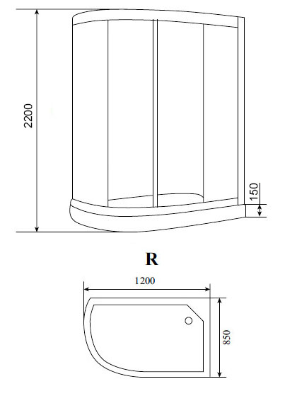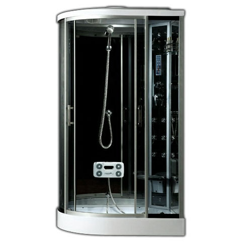 Акриловый поддон h - 15 см. с сифоном и усиленным каркасом. Анодированный алюминиевый профиль (матовый хром). Закаленное ударопрочное безопасное стекло толщиной 5 мм. Сенсорный пульт управления. Подсветка верхняя и боковая. FM-радио. Вентиляция. Смеситель однорычажный - четыре режима. Тропический душ. Лейка. Массажер ступней. Гидромассаж спины 6 джет. Двойные ролики. Стеклянная полочка. Откидное сиденье с допустимой нагрузкой не более 50 кг. Диспенсер. Ручки.
