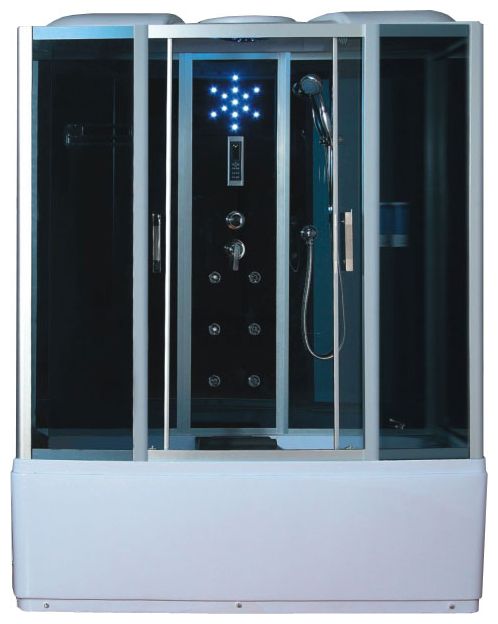 Акриловый поддон h - 60 см. Съемный экран из трех частей. Сливная система clik-clak со сливом-переливом. Анодированный алюминиевый профиль (матовый хром). Закаленное ударопрочное безопасное стекло толщиной 5 мм. Сенсорный пульт управления. Подсветка верхняя и боковая. FM-радио. Вентиляция. Смеситель однорычажный - пять режимов. Тропический душ. Лейка. Массажер ступней. Гидромассаж спины 6 джет. Наполнитель ванны. Двойные ролики. Подголовник. Стеклянная полочка. Откидное сиденье с допустимой нагрузкой до 80 кг. Диспенсер. Ручки.