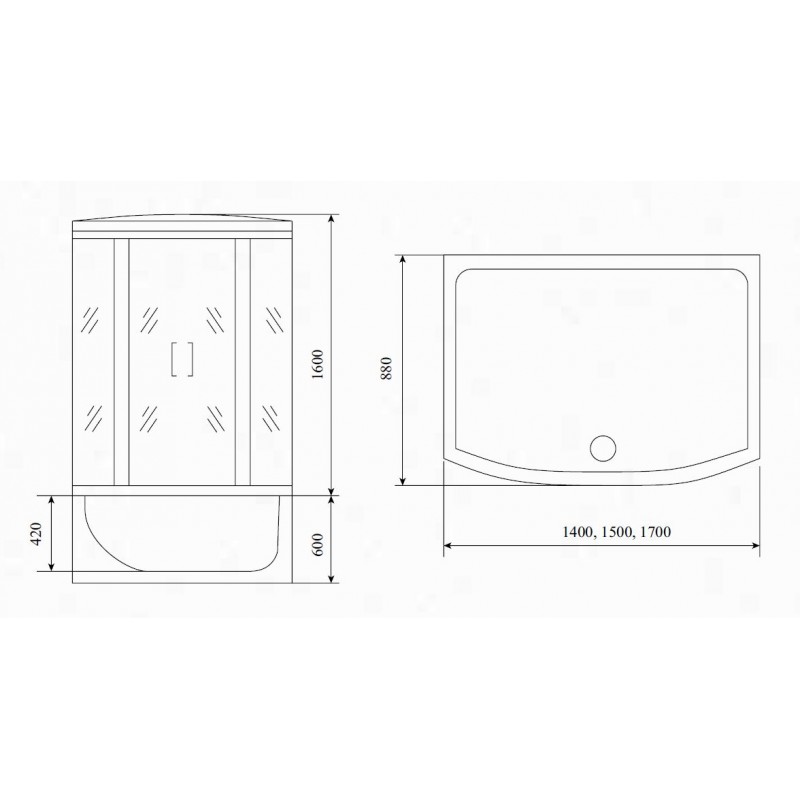 Акриловый поддон h - 60 см. Съемный экран из трех частей. Сливная система clik-clak со сливом-переливом. Анодированный алюминиевый профиль (матовый хром). Закаленное ударопрочное безопасное стекло толщиной 5 мм. Сенсорный пульт управления. Подсветка верхняя и боковая. FM-радио. Вентиляция. Смеситель однорычажный - пять режимов. Тропический душ. Лейка. Массажер ступней. Гидромассаж спины 6 джет. Наполнитель ванны. Двойные ролики. Подголовник. Стеклянная полочка. Откидное сиденье с допустимой нагрузкой до 80 кг. Диспенсер. Ручки.