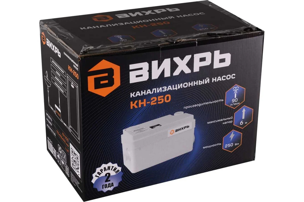 Канализационный насос Вихрь КН-250 используется для откачки стоков. Особенно необходим он в случаях, когда обустроить канализацию с трубами под наклоном по каким-то причинам невозможно. Мощность устройства составляет 250 Вт. Так как насос способен перекачивать 90 л/мин, то может применяться как для частных домов, так и небольших коммерческих объектов. Насос Вихрь КН-250 может поднимать перекачиваемую жидкость на высоту до 6 м, что делает его применение эффективным в сложных условиях. Напор по горизонтали может достигать 60 м, что делает насос подходящим для установки, где требуется прокачка жидкости на большие расстояния.