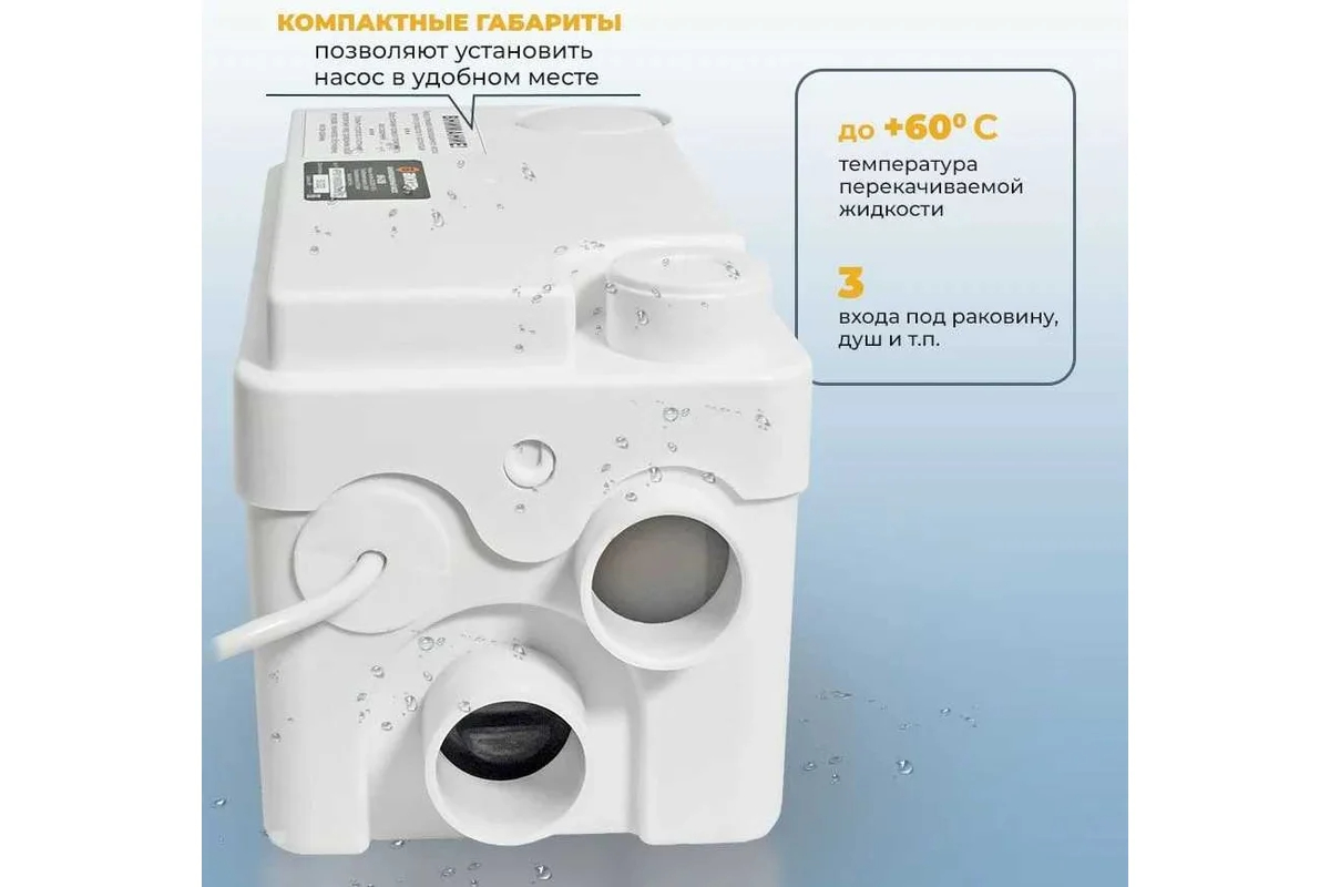 Одним из ключевых преимуществ модели является наличие двух входов, что позволяет подключать различные устройства, такие как раковины или душевые кабины, стоит отметить, что его конструкция не предполагает подключения туалета. Канализационный насос выдерживает температуру перекачиваемой жидкости до +60°C, что позволяет его использовать в обычных домашних условиях.